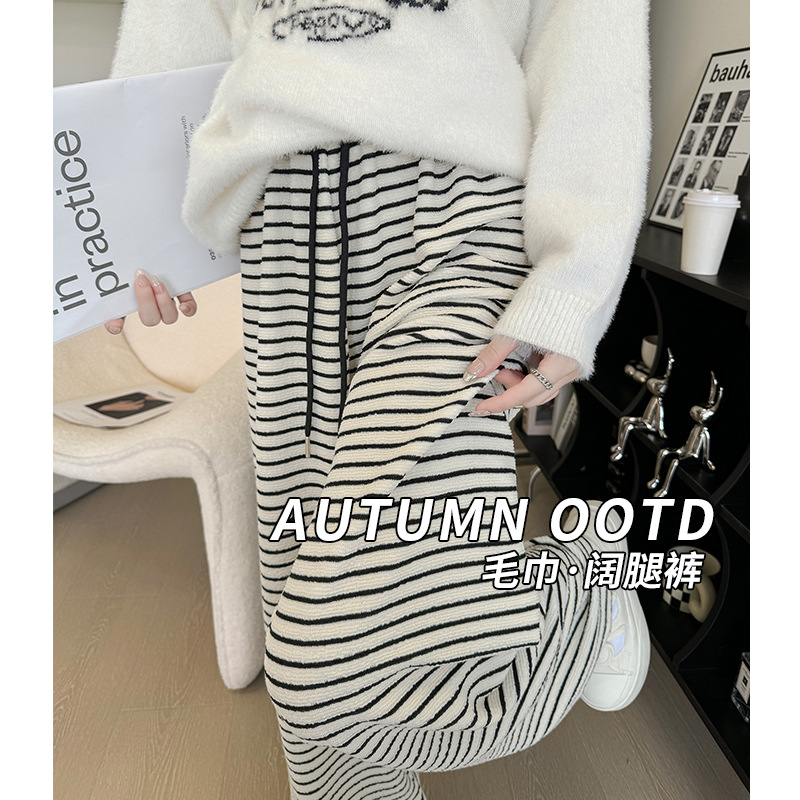 白黒のストライプのズボンの女性のズボンの春秋の新型のbfの怠惰な風の高い腰のストレートのズボンは曲がっている感じのタオルのワイドレギンスのズボンを散歩します。