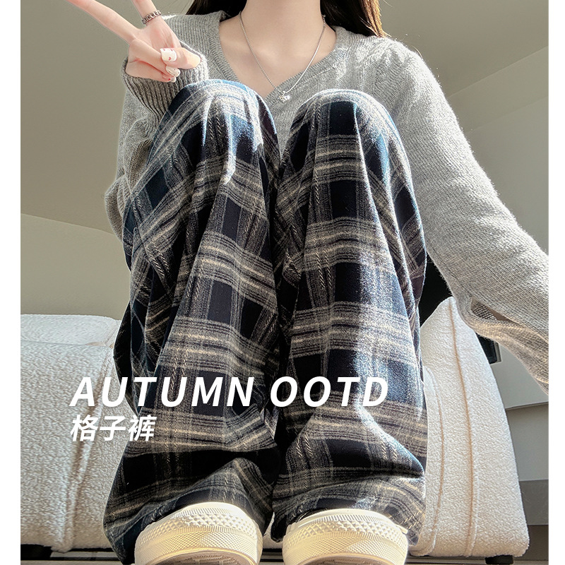 黒い格子縞のズボンの女性のズボンの秋の女性の2024高腰の垂れ下がった感じの外はまっすぐなズボンのカジュアルなモップのズボンを着ます。