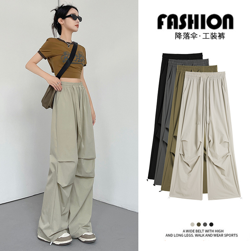 アメリカのスポーツズボンの女性の服装のズボンの子供の夏の薄いタイプのカジュアルなパラシュートのズボンの広い足の高い腰の速乾の仕事のズボン