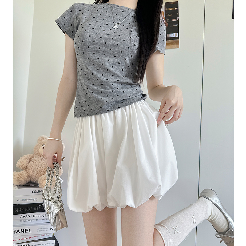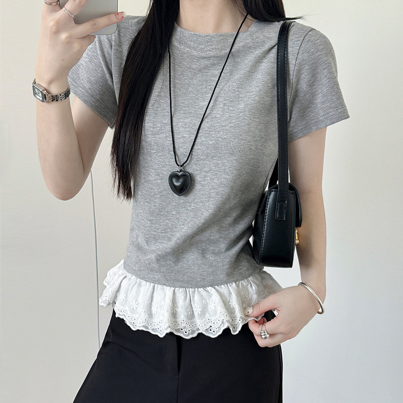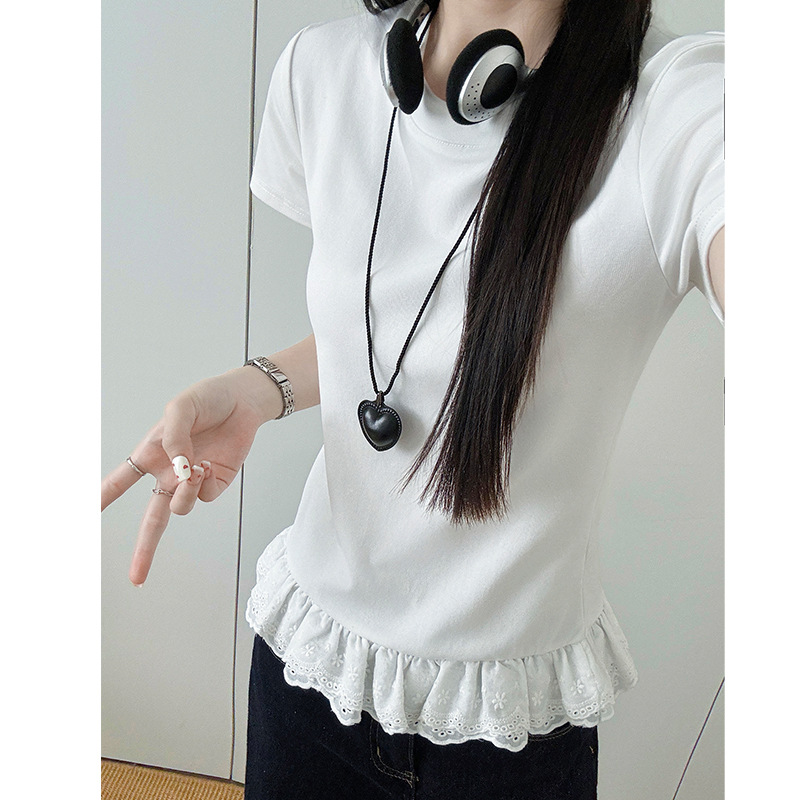韓国系レースの裾の肩の半袖tシャツの女性の夏の新型の甘くて似合うのはやせているバレエ風の上着です。