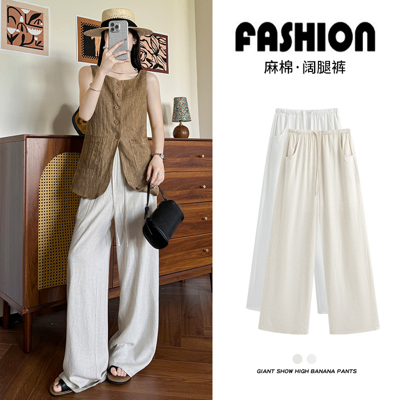 高品質の麻綿の白い広腿のズボンの女性の夏の新型のゆったりしているストレートのカジュアルなズボンはやせています。