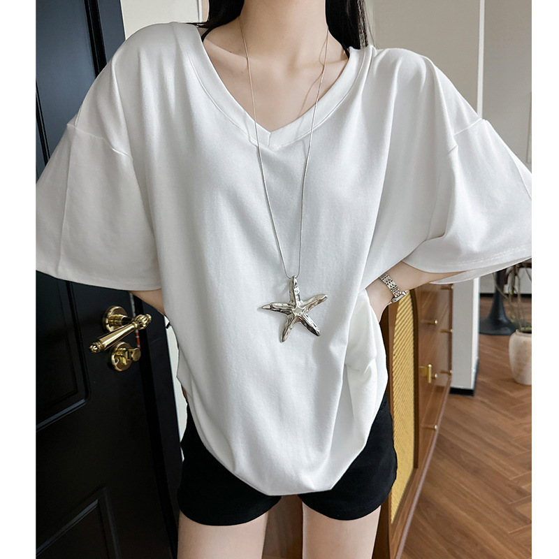 白いvネック半袖tシャツ女性夏2025新型韓国系ゆるい中長タイプのシャツが痩せている