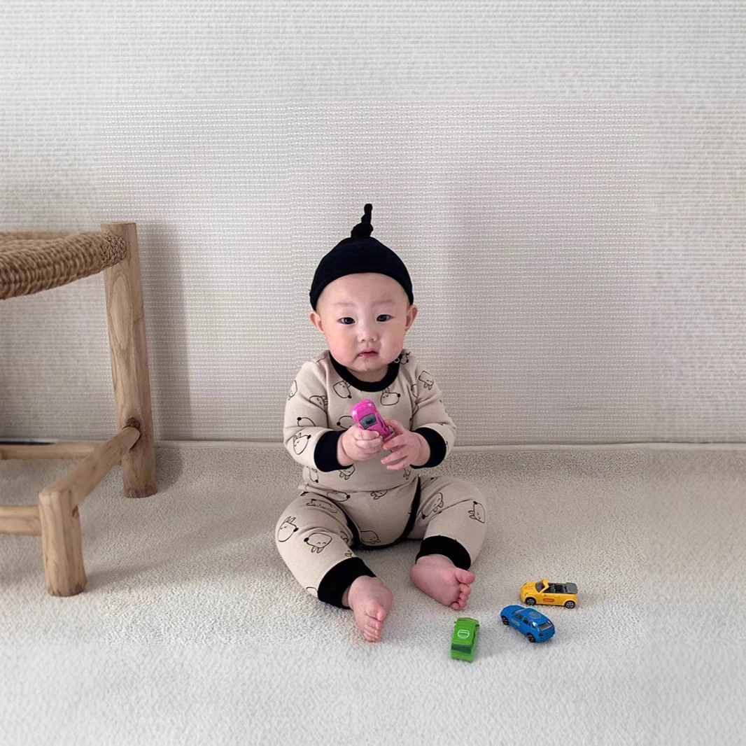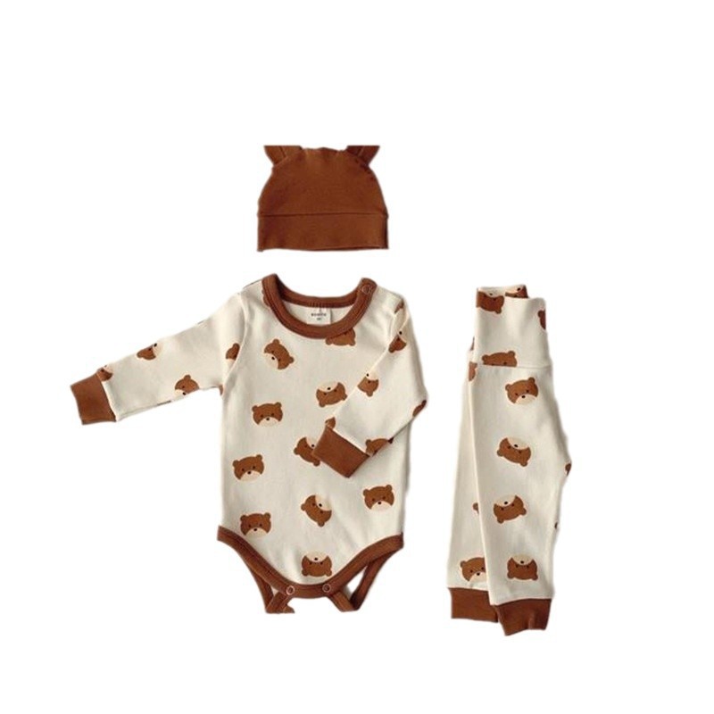 男女兼用ベビー純綿漫画風クマ柄3点セット 赤ちゃん春秋冬用ホームウェア下着セット