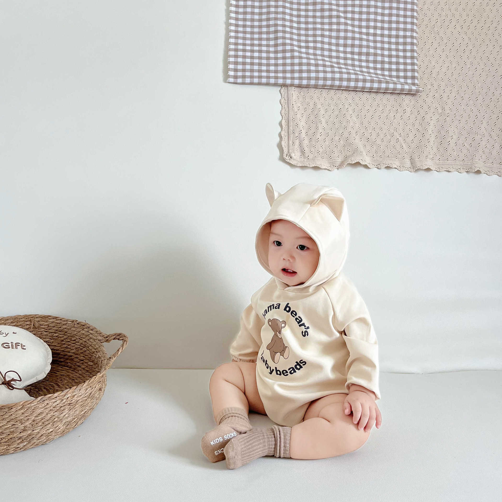 25秋韓国版ベビージャンプスーツ、新しいクマプリントのフード付きロンパース、ベビー長袖ロンパース