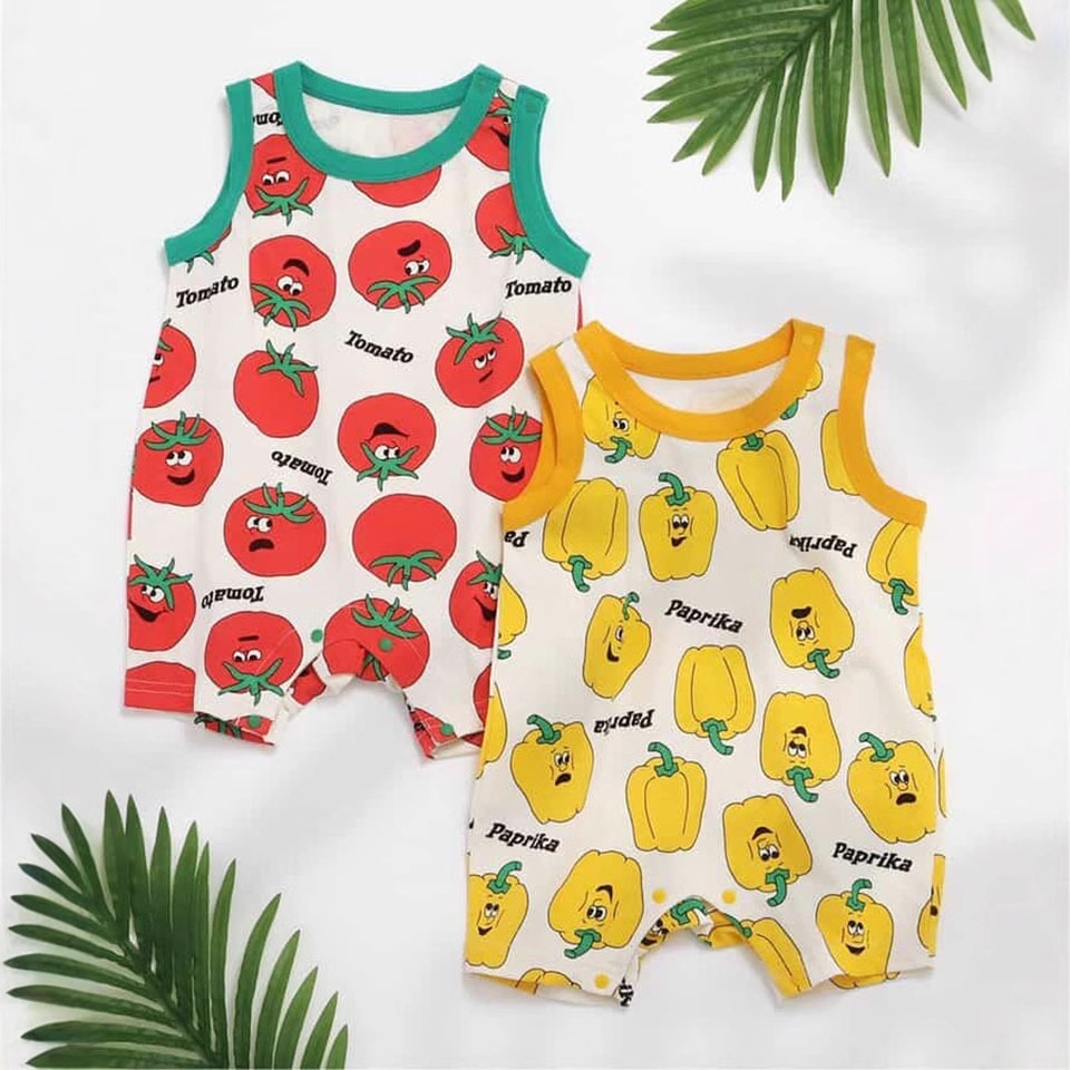 25 新しい夏のベビージャンプスーツ韓国風かわいい野菜プリントノースリーブベビー外出服