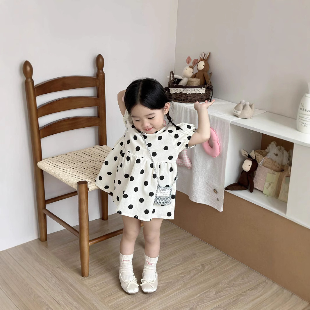 25夏の新型韓国版子供ワンピースネット赤ドットプリント半袖スカート