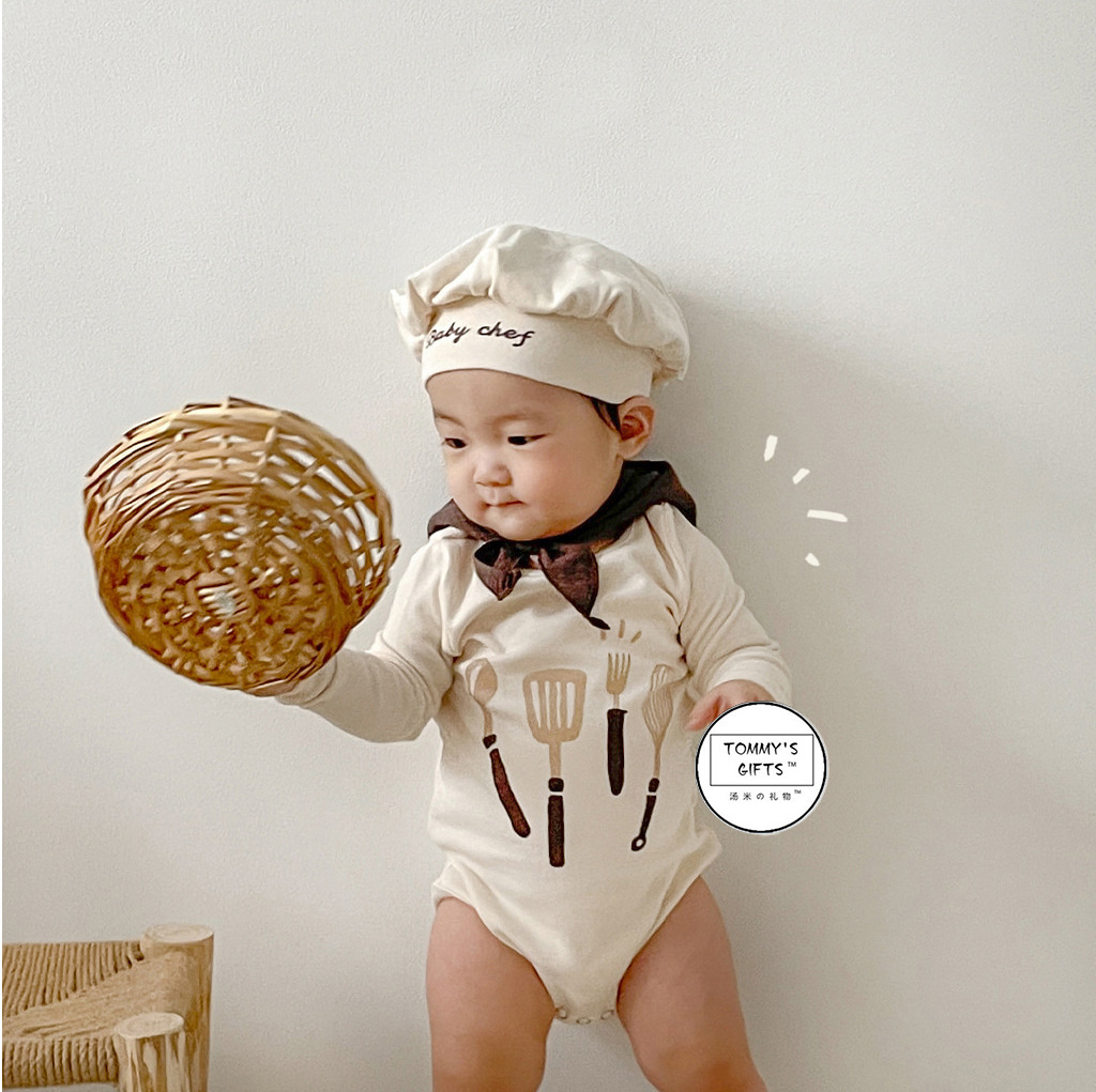 2025年春の新作ベビーシェフ風ロンパース、インスタイル幼児用ワンピース、ベビー100歳服