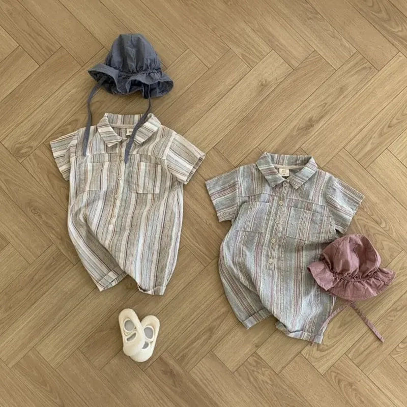 25 夏韓国スタイルベビーローブ、ストライプ織りベビージャンプスーツ、カジュアル紳士スタイル半袖ボディスーツ