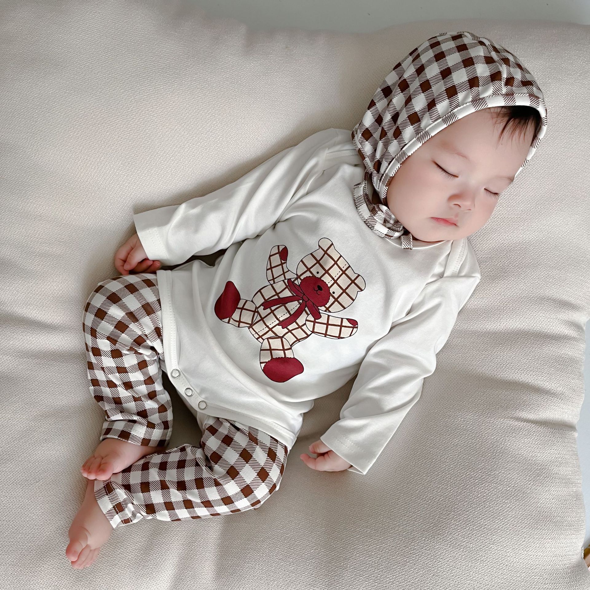 24秋の新型韓国版の連体服insの愛の格子の熊の3セットの赤ちゃんの連体は外に出て服を登ります。