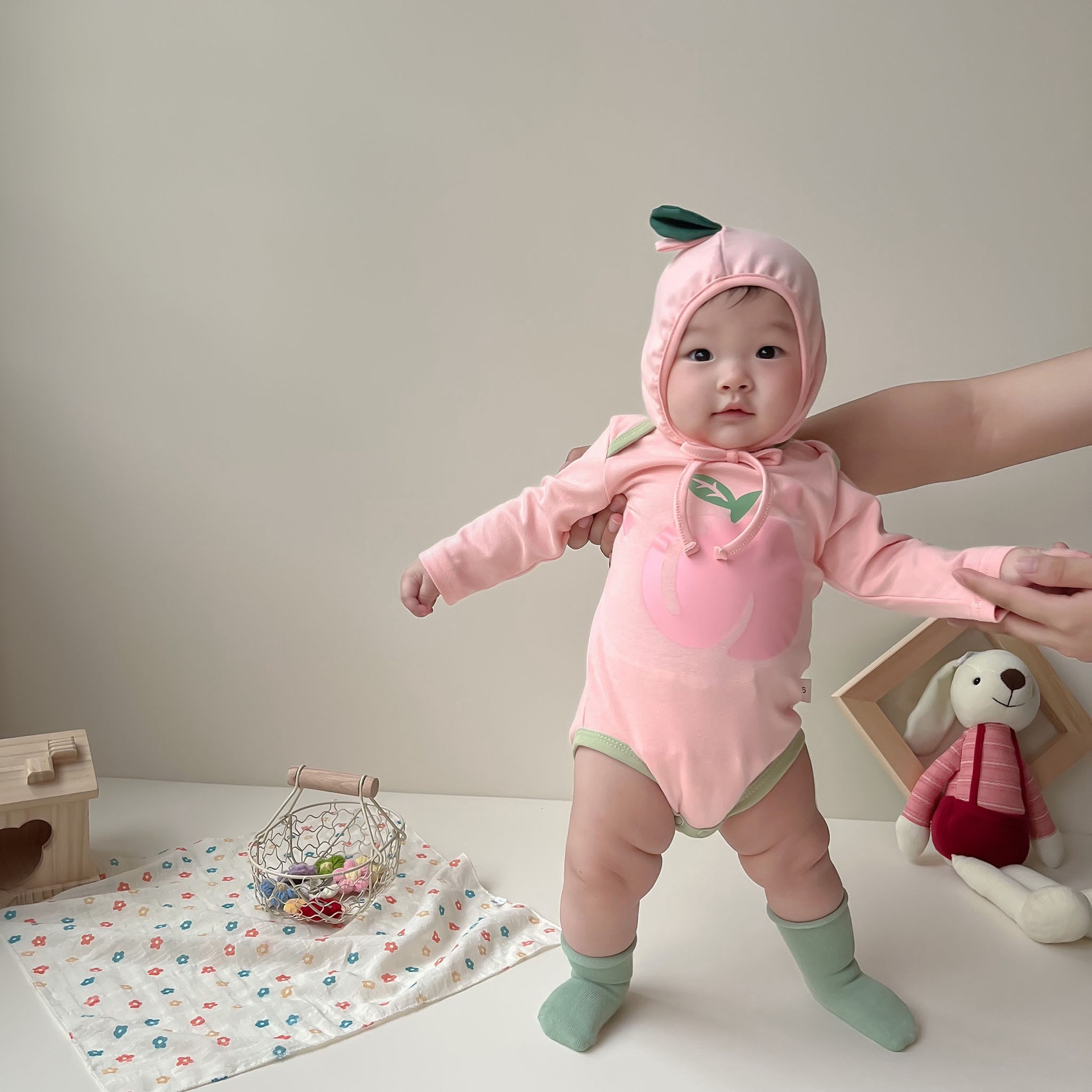 25秋の新作韓国風ベビージャンプスーツ、インスタイルピーチプリントロンパース、ベビーロンパース