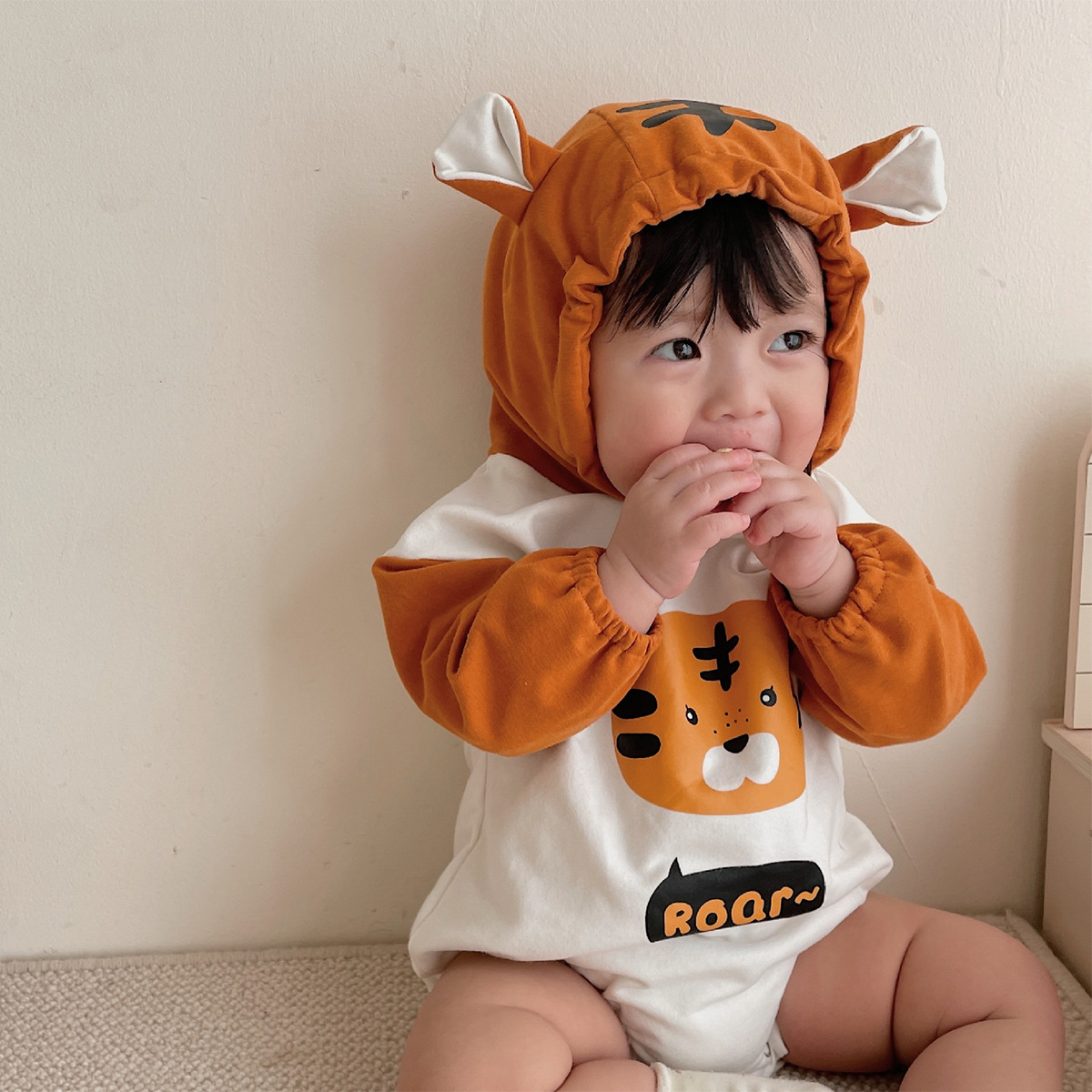 2025 春の新タイガープリントフード付きハーレム ins スタイル幼児クロール服ベビー外出バッグおなら服