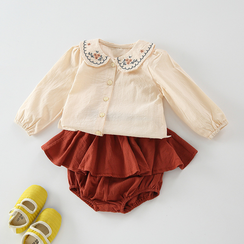 25秋の女の子用セット、韓国風新作刺繍襟付きベビー服、女の子用Tシャツとスカートのツーピースセット、可愛いトップス
