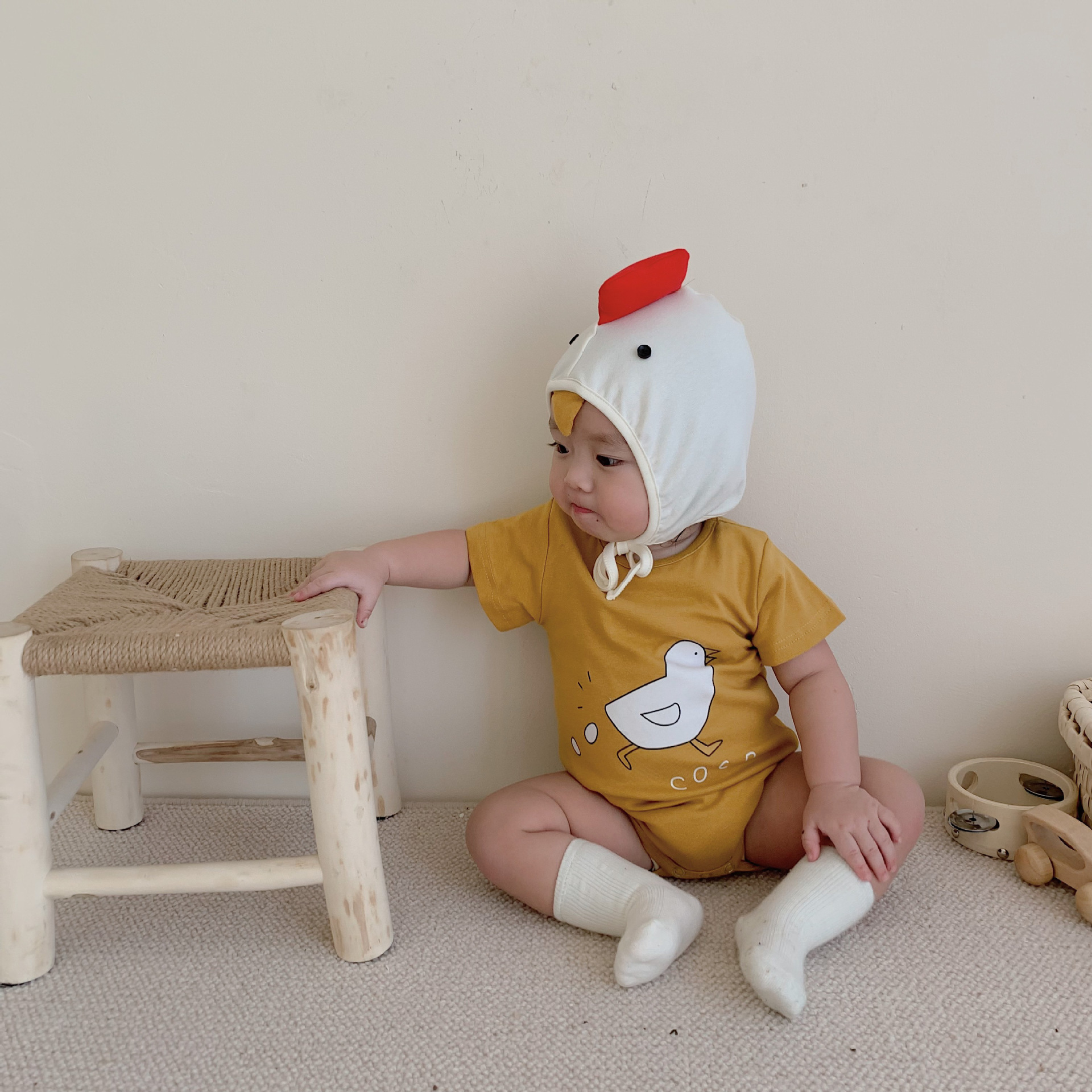 2025年新作夏ベビージャンプスーツ、インスタイル、ひよこが卵を産むプリント、半袖ロンパース、ベビー外出服