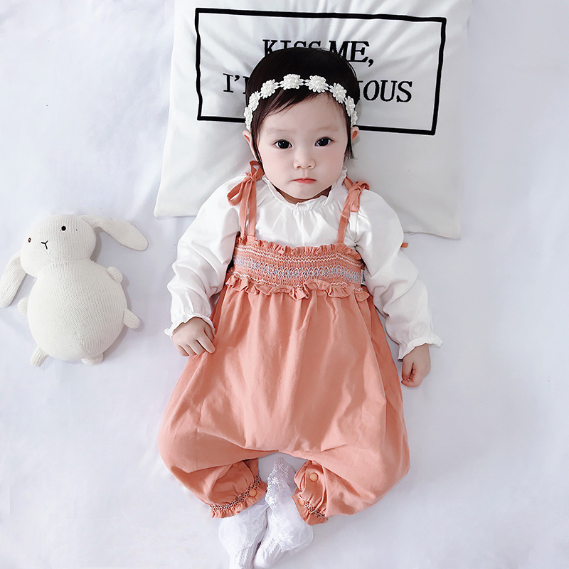 25韓国版春の新作子供服ベビージャンプスーツ秋長袖ツーピースセットサスペンダーロンパースレース襟ロンパース