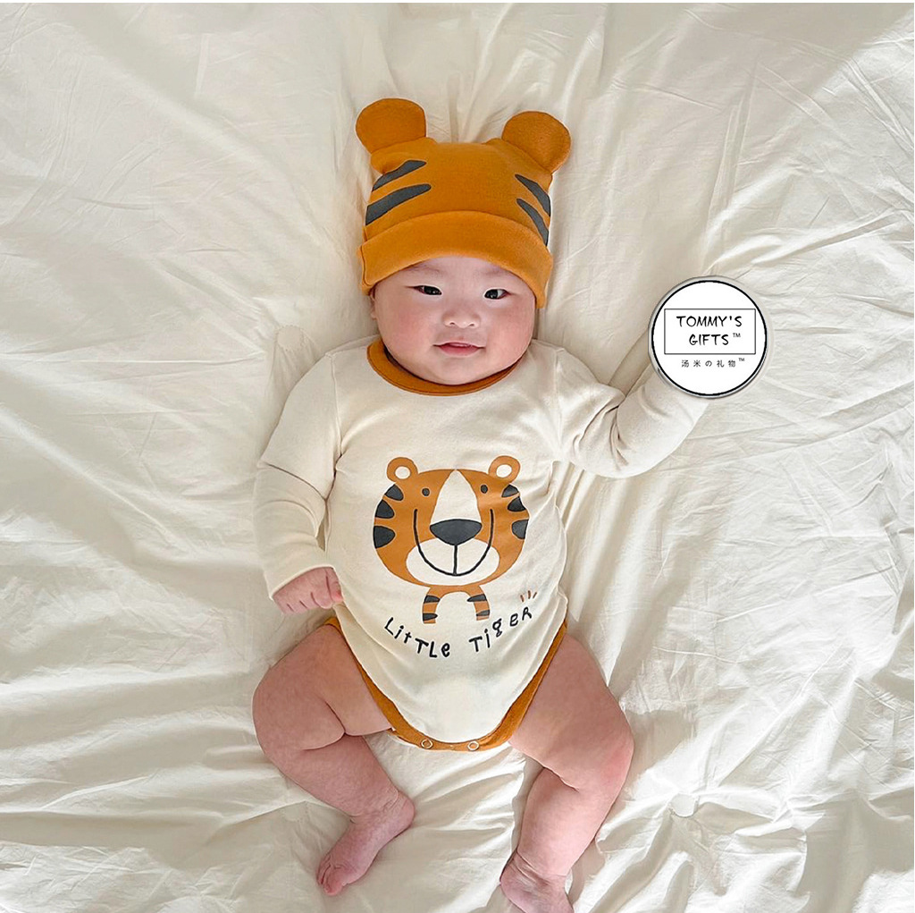 2025年春の新作タイガープリントロンパース、幼児・幼児用ロンパースセット、子供用100歳服3点セット