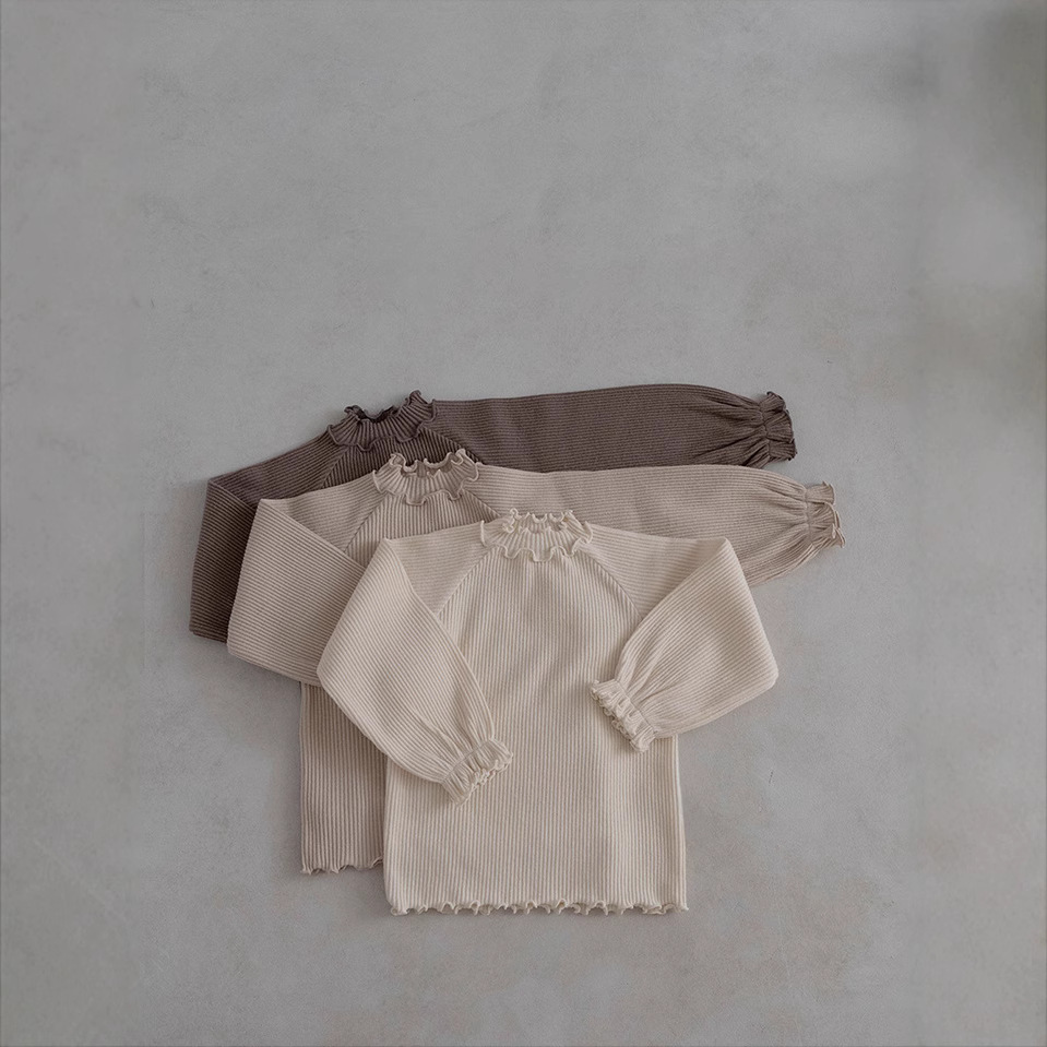 24秋の韓国版子供tシャツins北欧風坑条長袖底シャツ蝶結び子供長袖上着