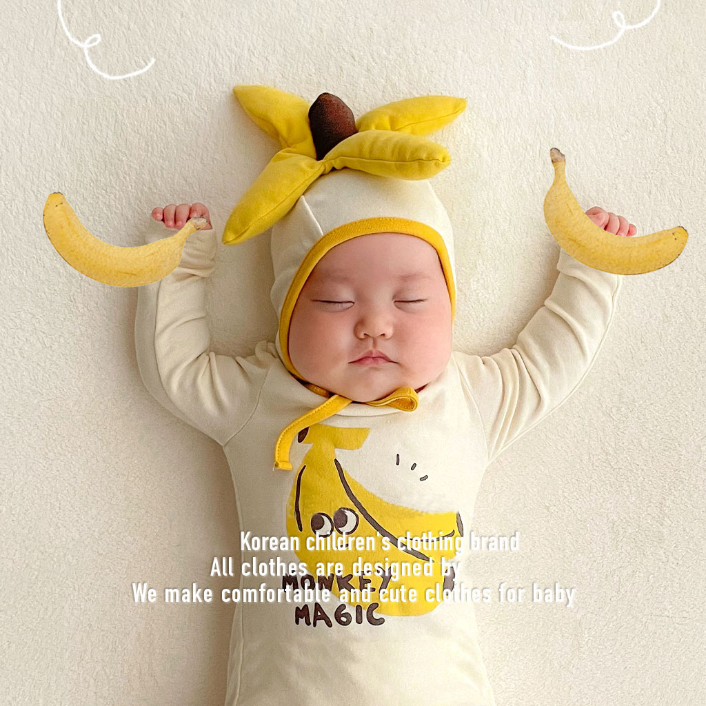 2024秋の韓国版赤ちゃんの連体服insのバナナの形のプリントは、赤ちゃんのお尻の服に帽子をつけます。