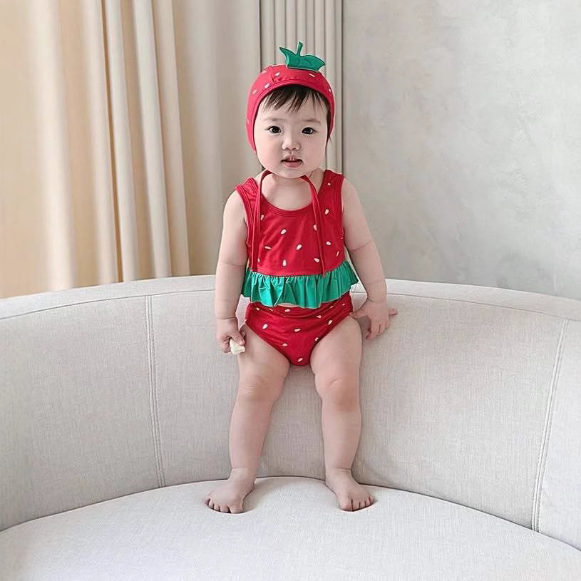 25 夏韓国風フリル水着 3 点セットインスイカ型スプリット水着ベビー水着