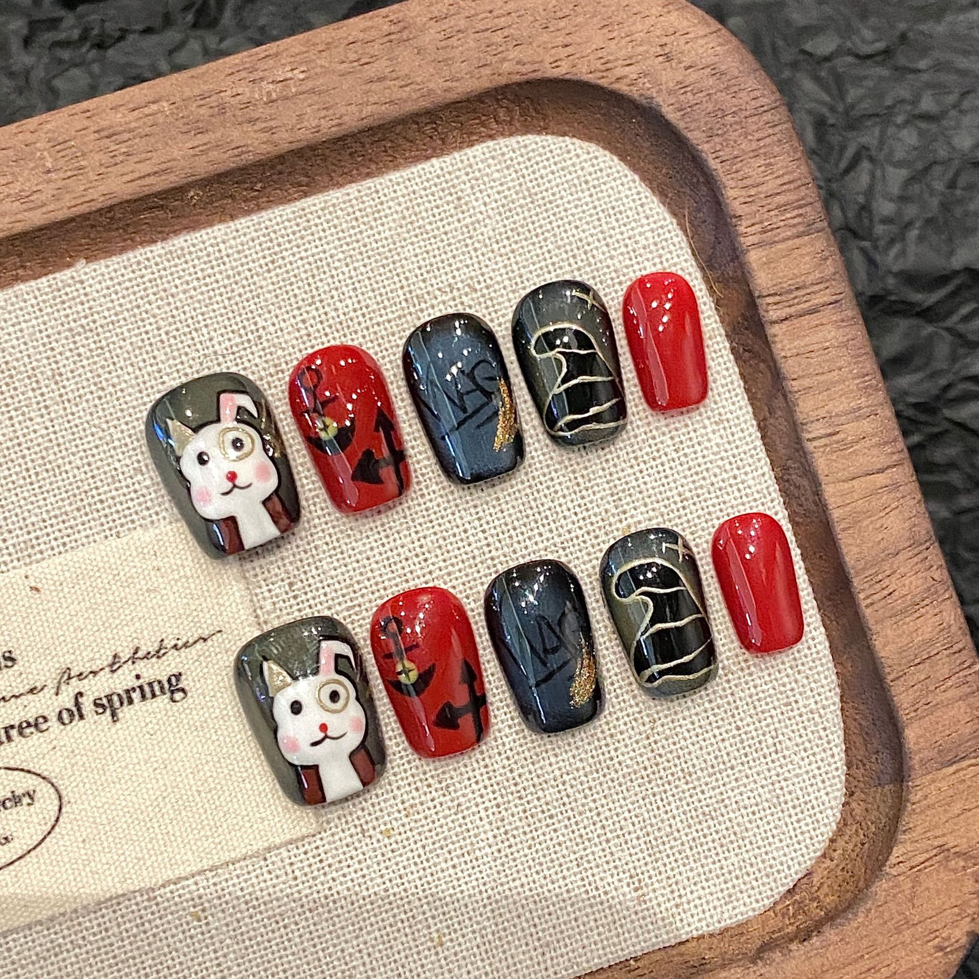 芸和 大きな目のウサギ 純手作りのウェアラブルネイル 手描きアニメ漫画 かわいい 取り外し可能なウェアラブルネイル 白い肌に映える