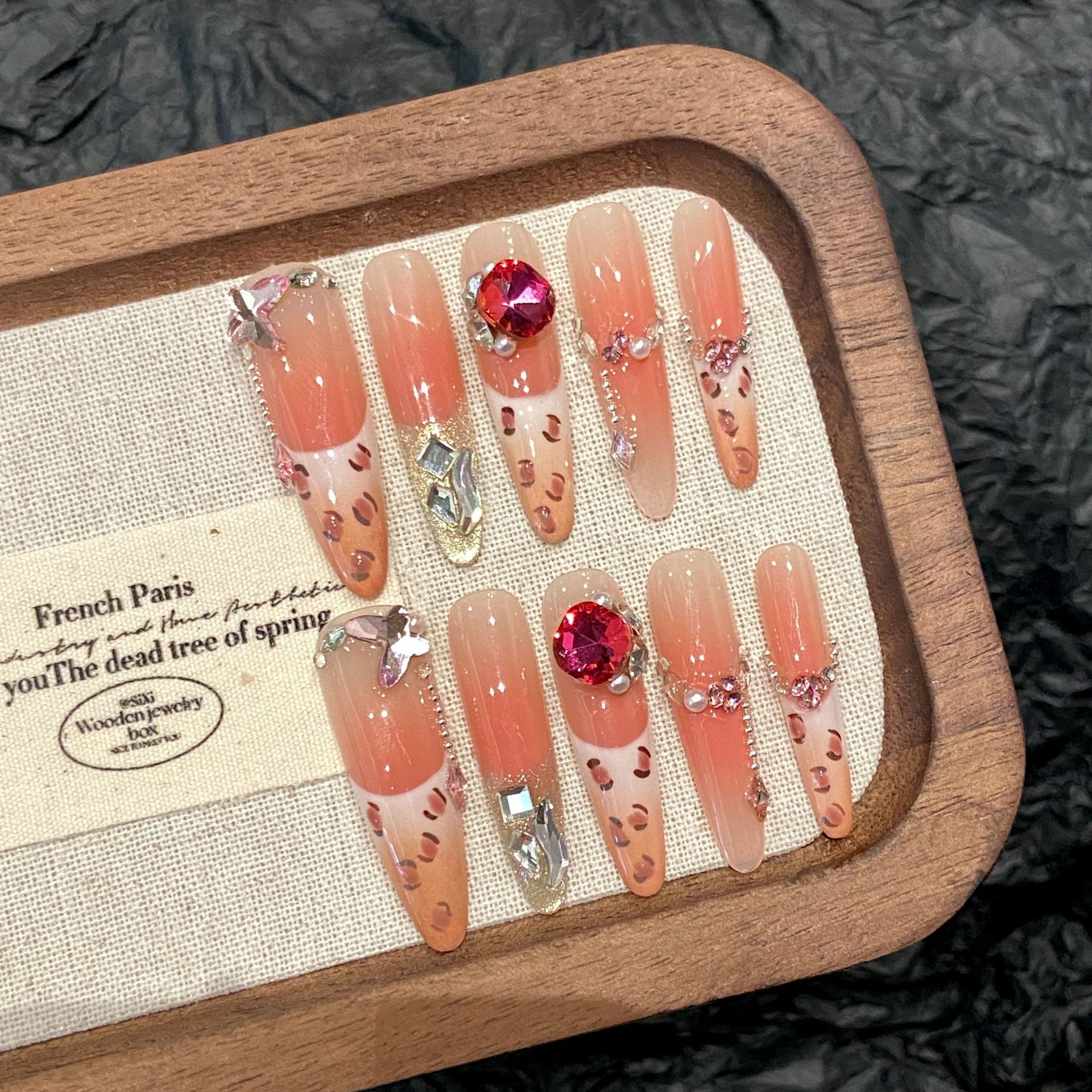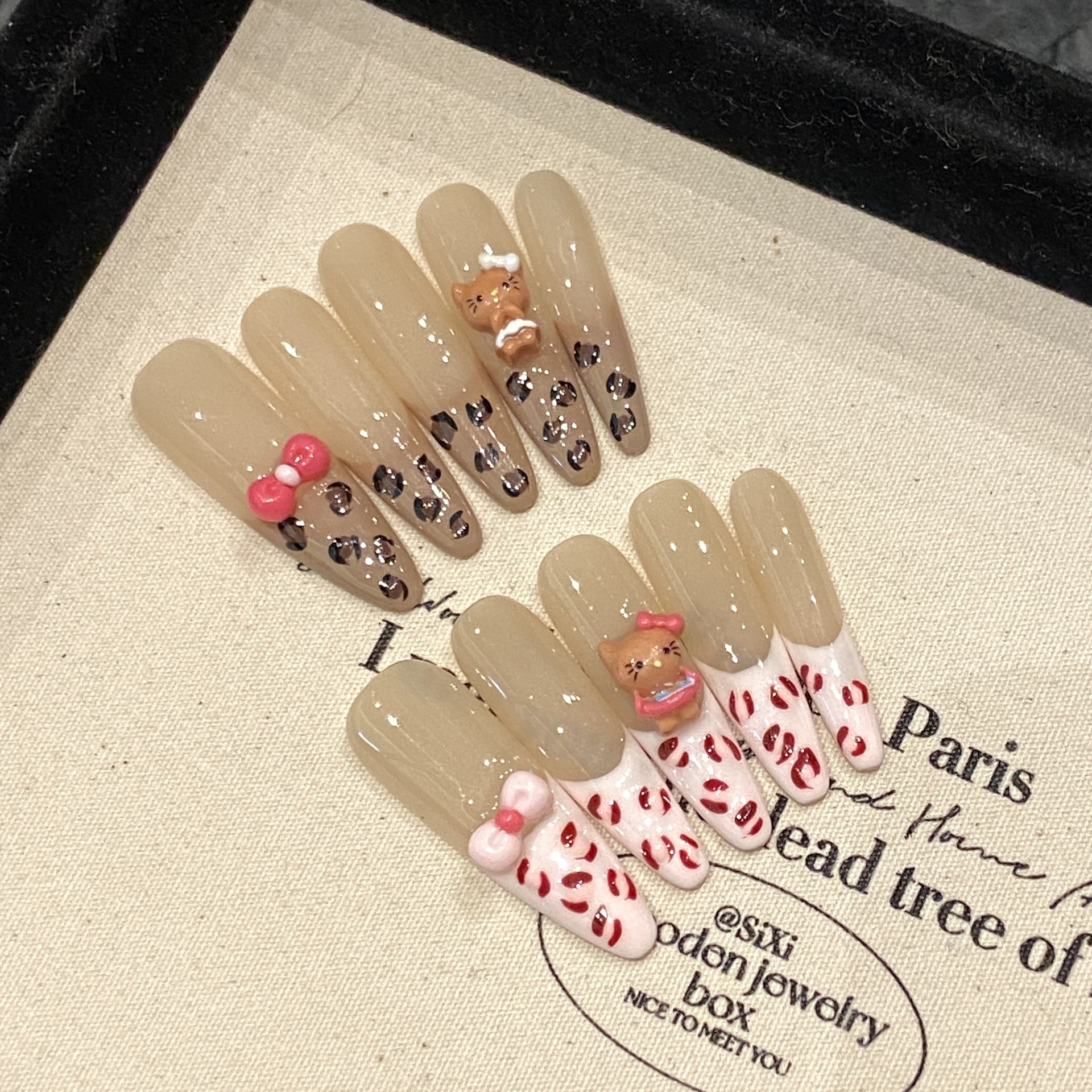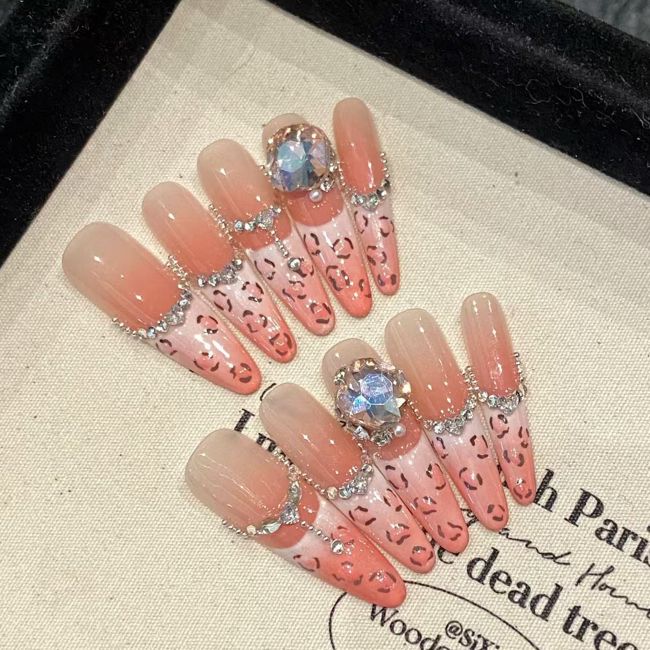 Yihe ピュアディザイア ピンク スイートハート レオパード柄 ウェアラブルネイル ハンドメイド スイートフレンチ ライトラグジュアリーネイルアート 4.0 テリアロングチップ