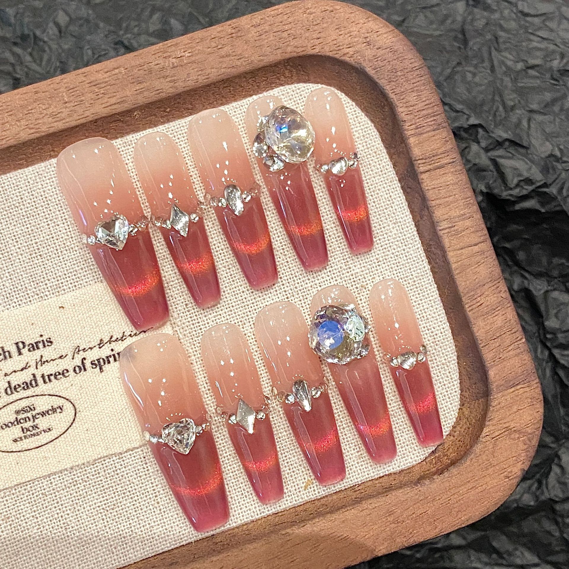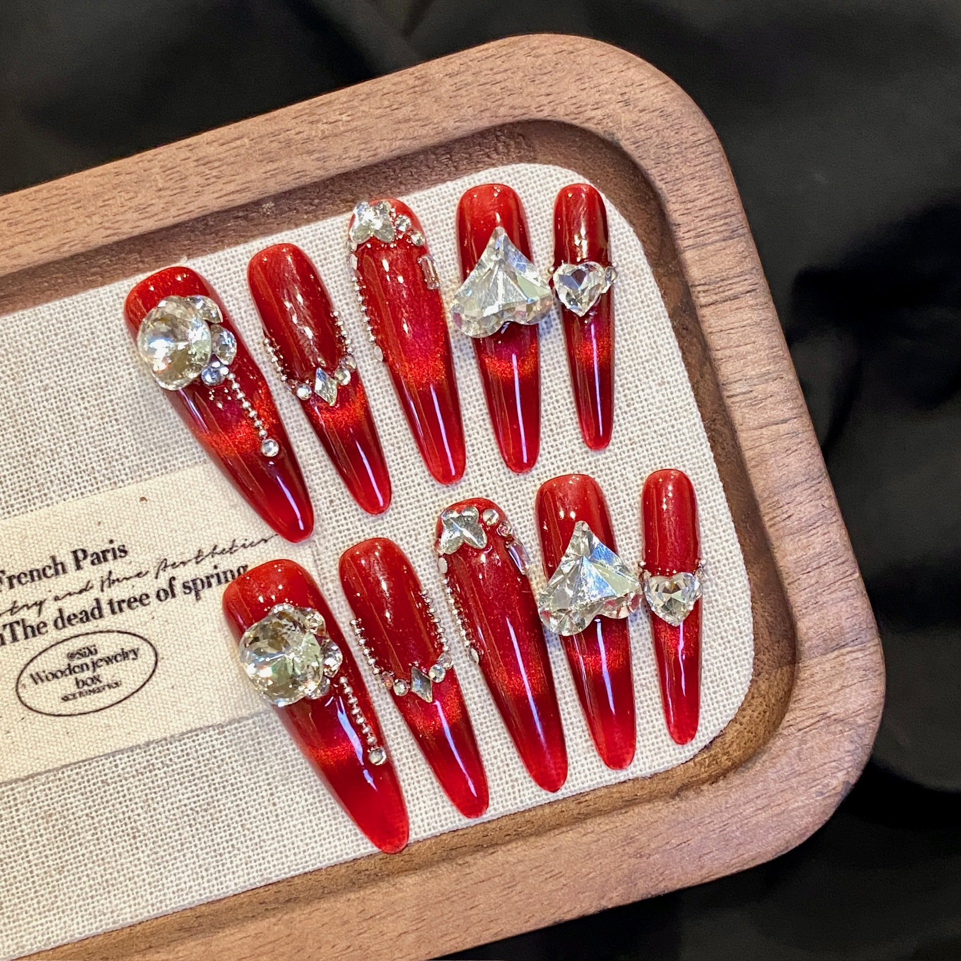 藝和美甲 新年甲 紅色フレンチキャットアイ 幸運の斜めダイヤモンド 新年雰囲気 手作りつけ爪