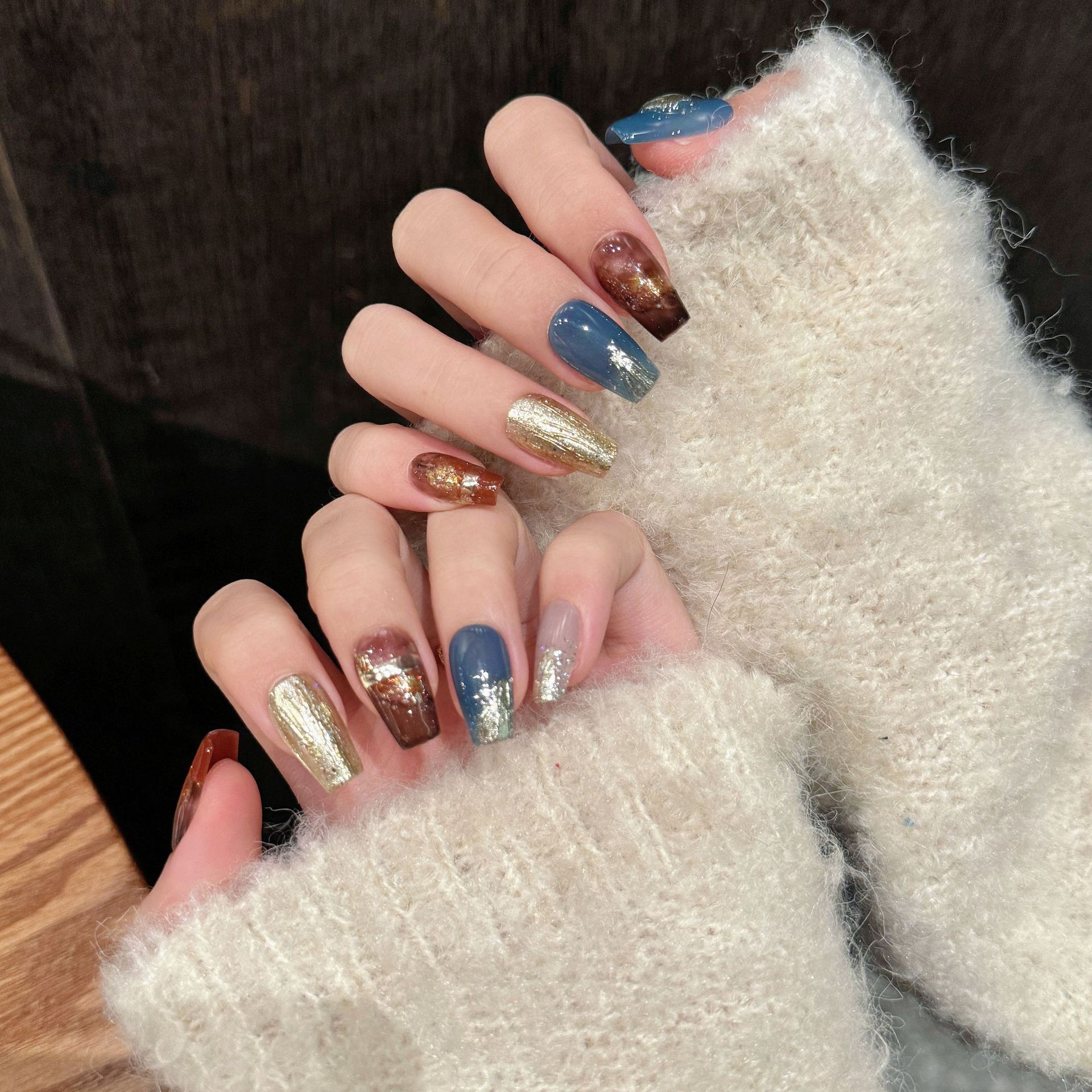 イーホーネイル 秋冬美白メタリックテクスチャーブレンド ウッドリーフオータムサウンド メイラードコントラストカラー シンプルつけ爪