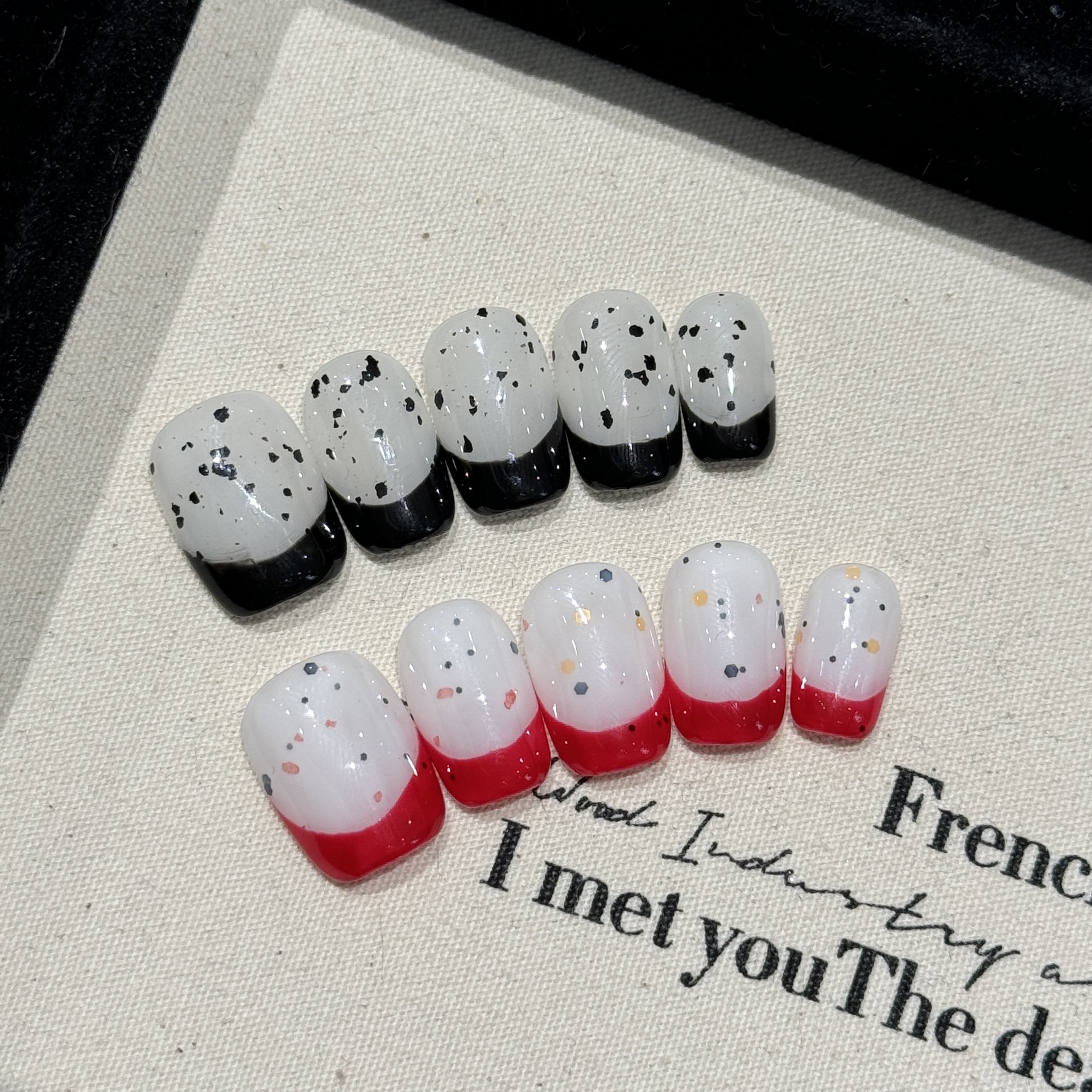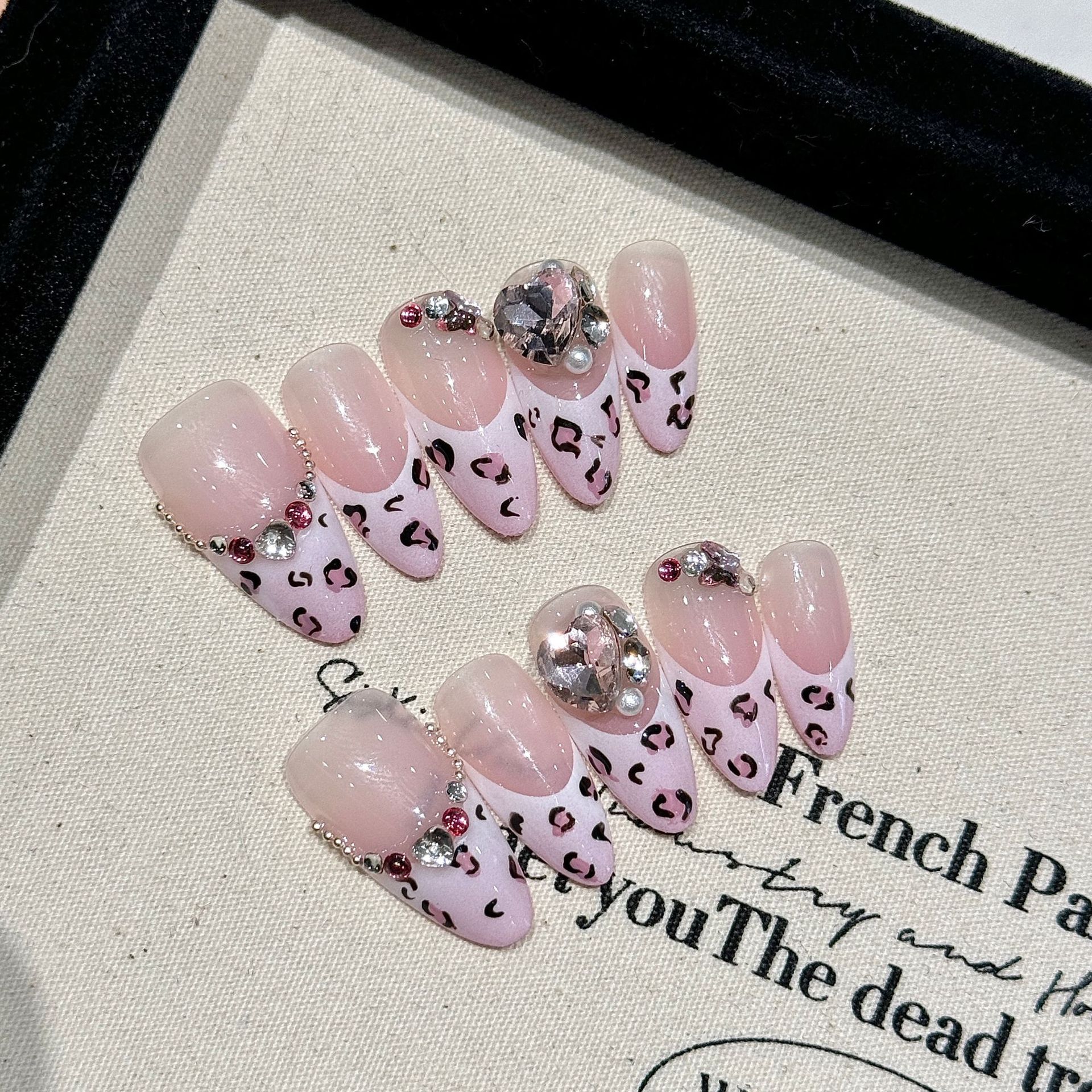 芸禾Kitty純手作り豹紋フランス甲片は甲を着て白いパッチを着てかわいいネイルアート秋冬金
