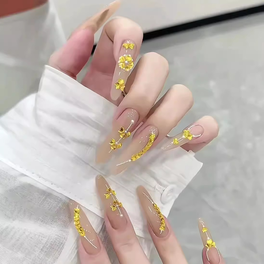 芸禾の純粋な手作業は甲のネットの赤い人気の夏の経典の裸の色の黄金の麦の穂の気質の高級な長い金のネイルアートを身につけます。