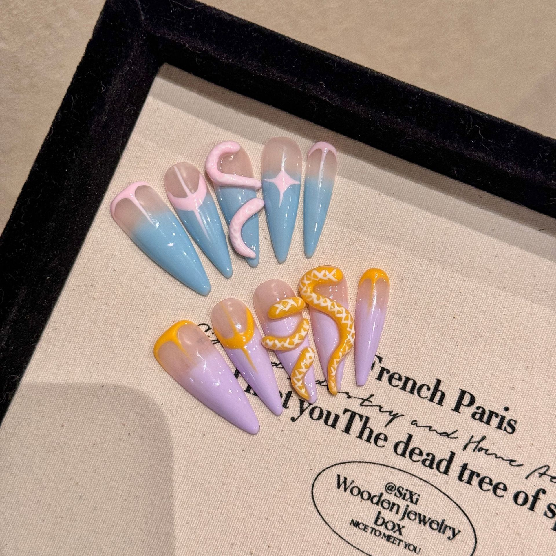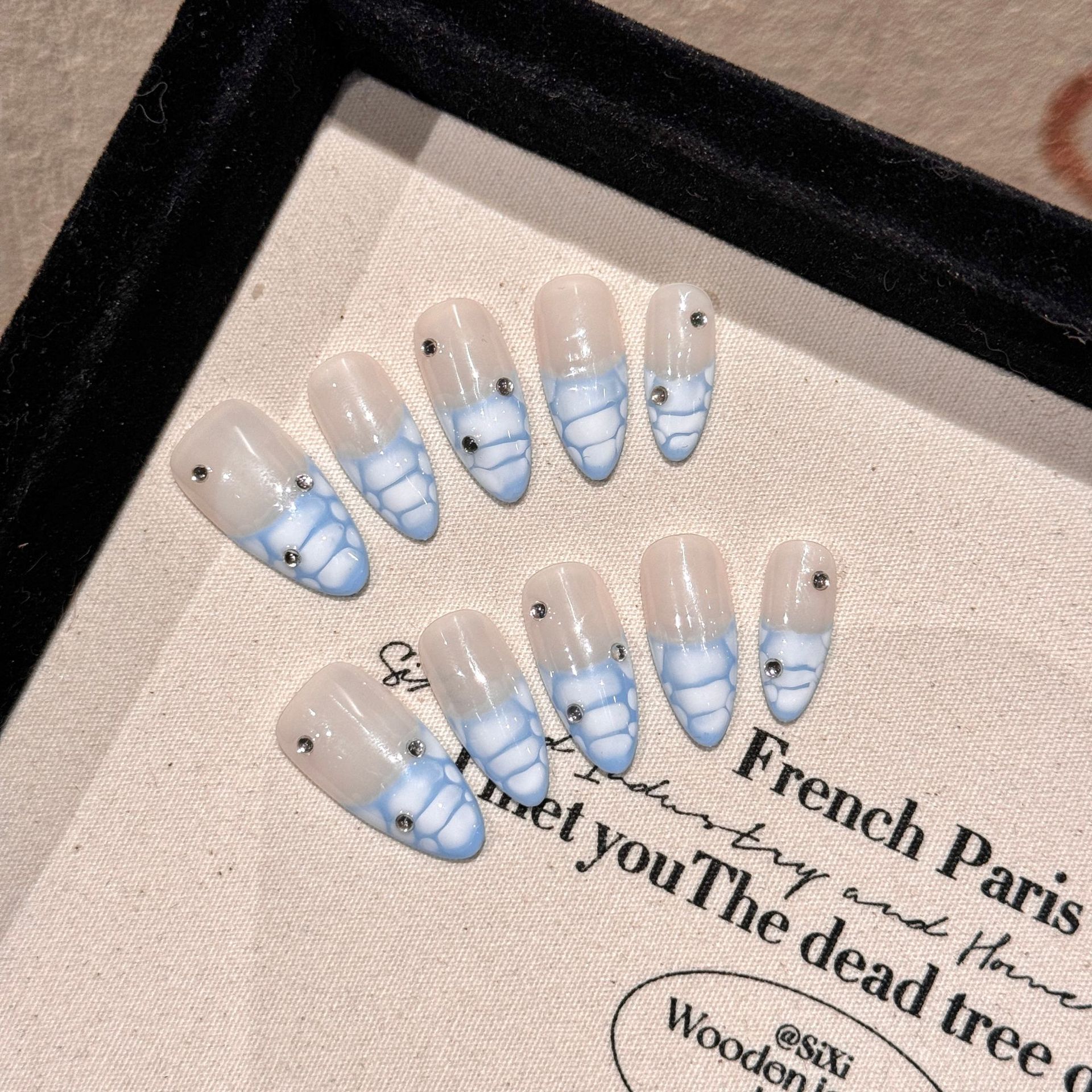 芸禾のギャルの青い粉のグラデーションのアヒルの小蛇の純粋な手作りのネイルは甲を着て卸売りの完成品を取り外します。