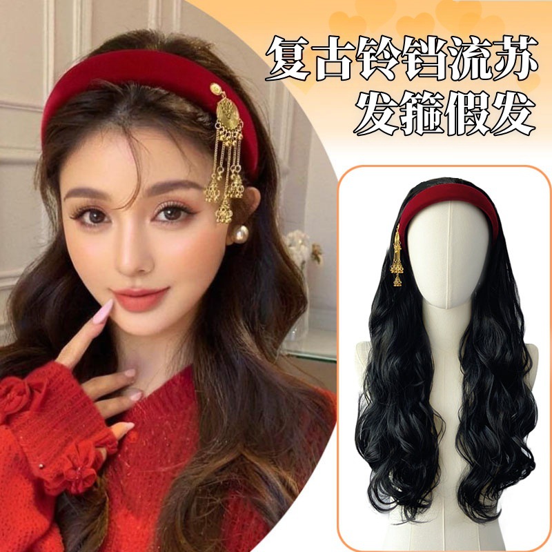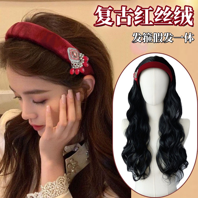 ショートビデオ偽発送女性用レトロレッドベルベットヘッドバンドロングカーリーヘアオールインワンU字型化学繊維ハーフヘッドギア