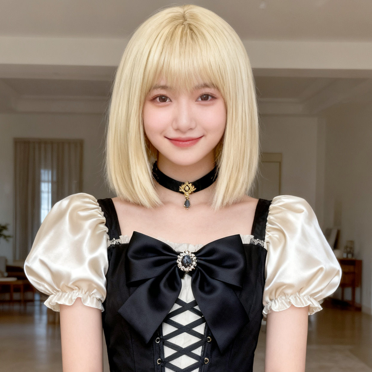 韓国版のかつらの女性の薄い金色の短いまっすぐな髪のboboの頭のネットの赤い漫画の斉前髪の全頭のカバーの現物は代行します。