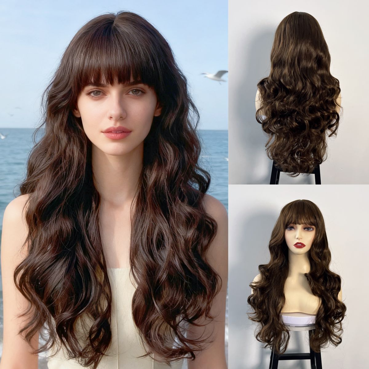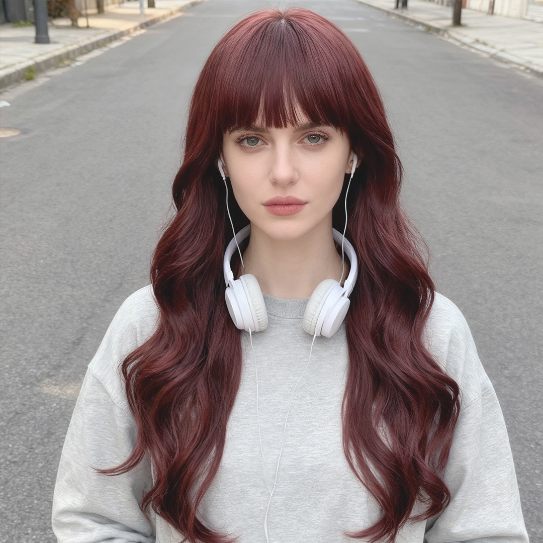 日韓系のかつらの女性のシミュレーションの髪の空気の前髪の長い髪の大きい波のワインの赤い化繊の頭カバーのメーカーの直接販売