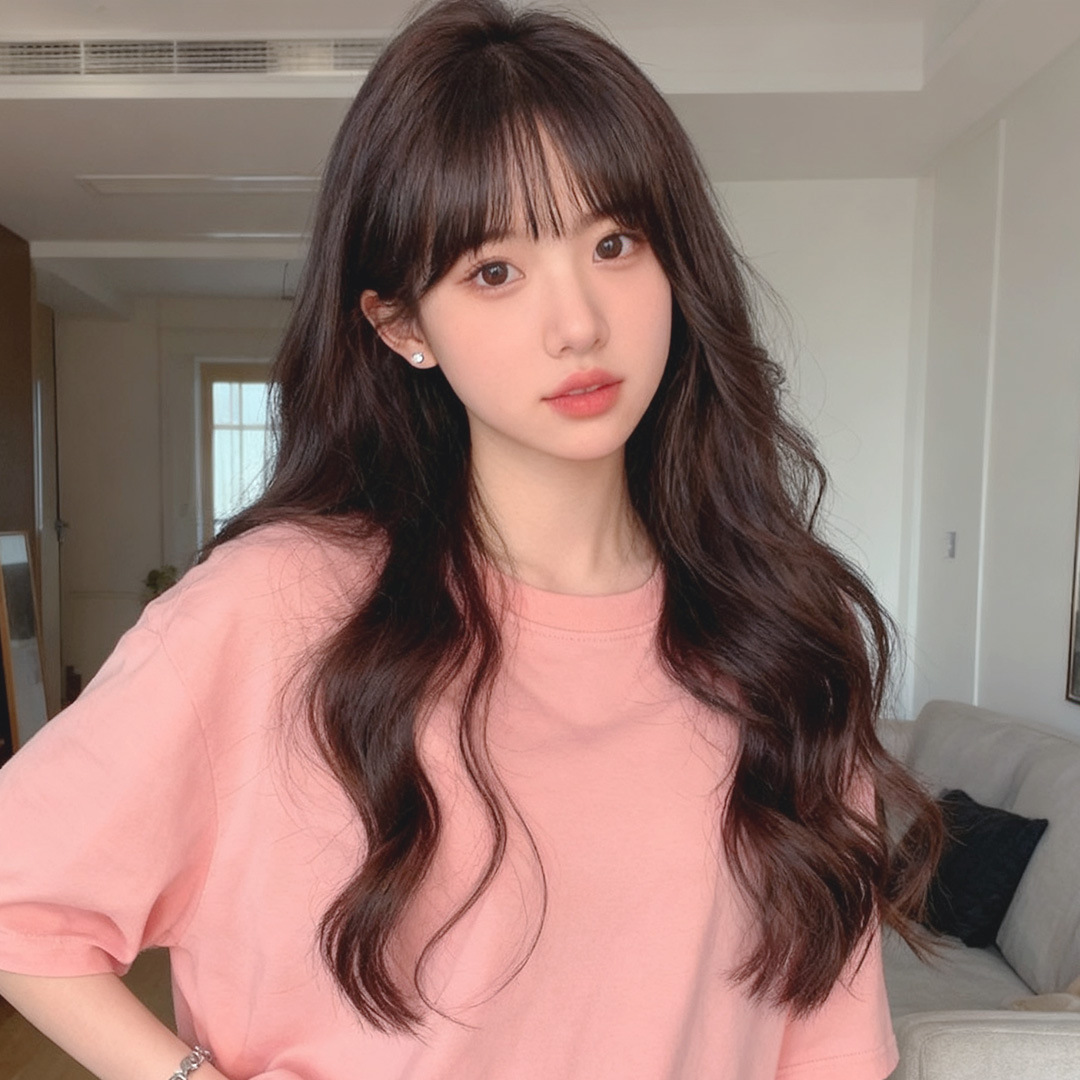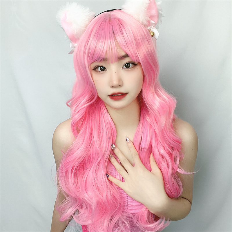 メーカー直販かつら女性ピンクlolitaロングカール空気前髪化繊かつらカバー
