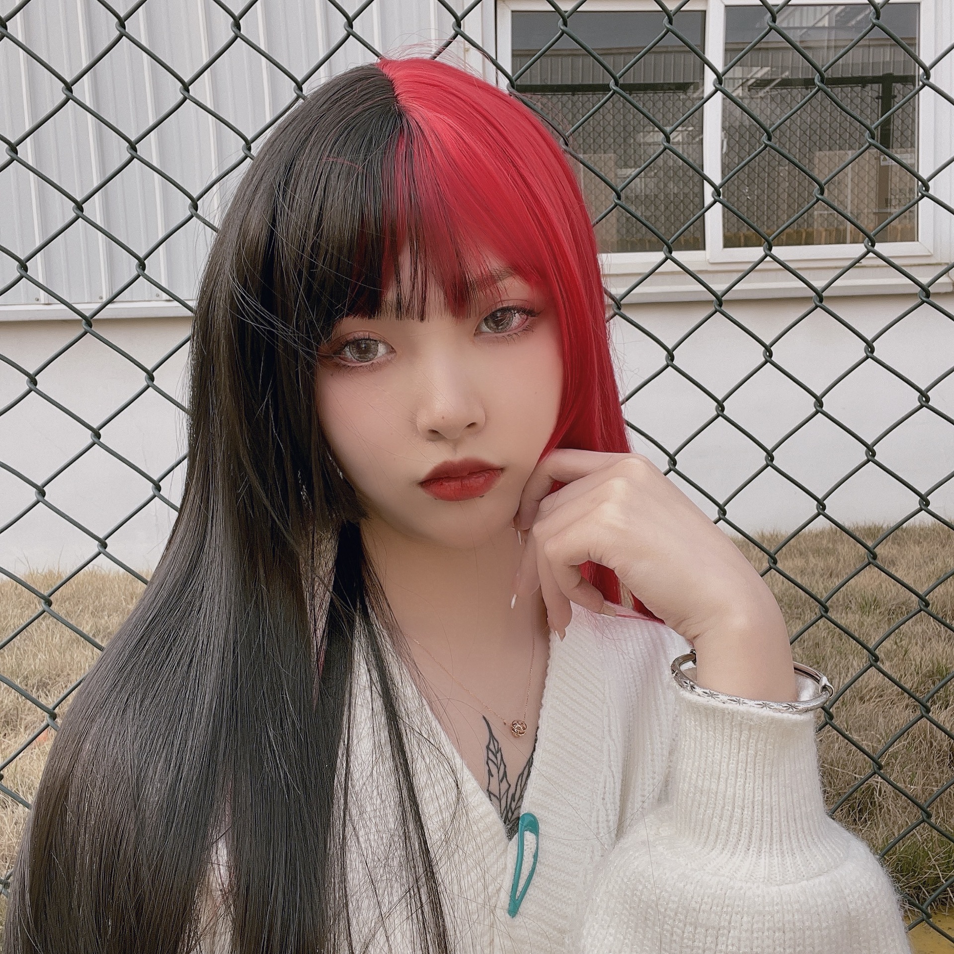 ハロウィンの道具のかつらの女性の長いまっすぐな髪の王女は黒と赤の2色の陰陽の頭の化学繊維のかつらのセットの越境の商品の供給源を切ります。