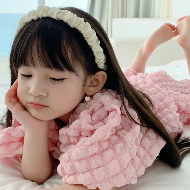 子供のかつらの女性はまっすぐに前髪をしています。赤ちゃんは写真を撮ります。