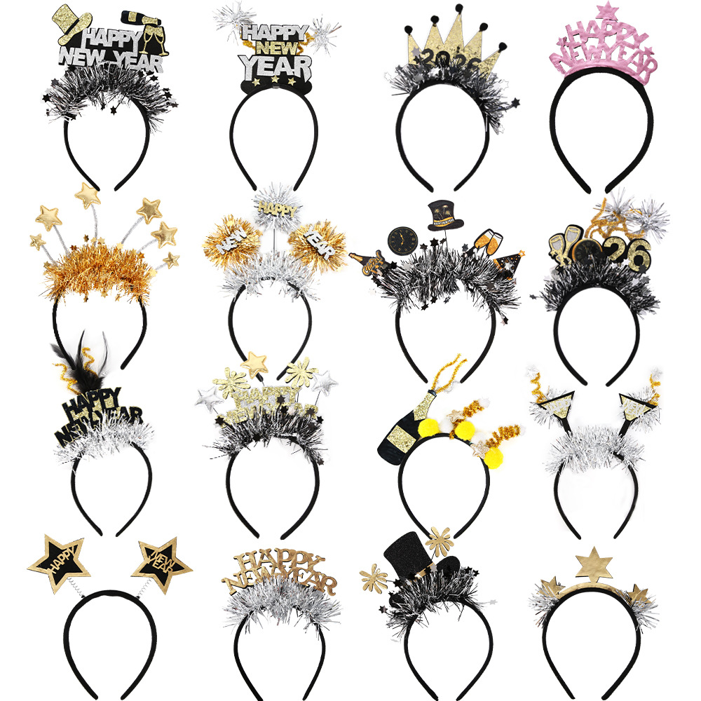 2026年新年あけましておめでとうございますヘッドバンド、大晦日ブラックゴールドテーマパーティーカラフルストリップヘアアクセサリーヘッドバンド、星型ワイングラスレターヘッドバンド
