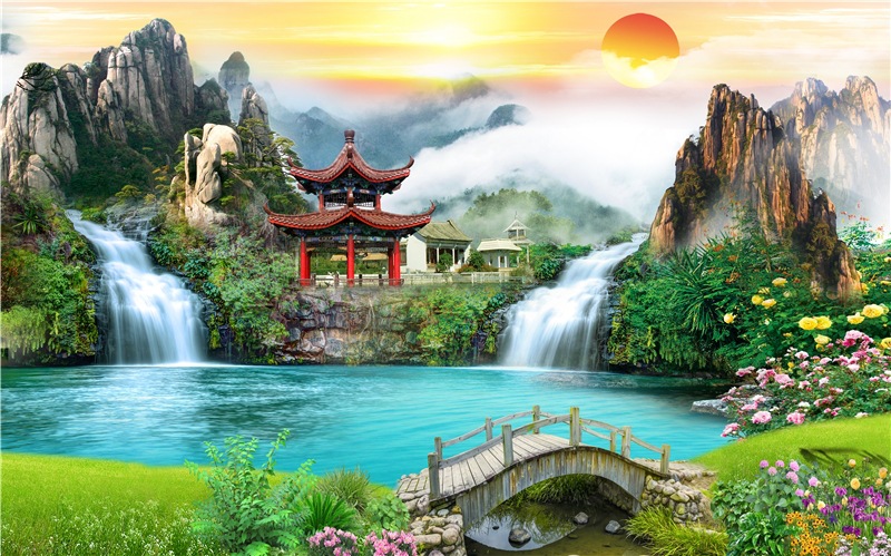 Vhm7仙堂山水画堂口背景流水生財人間仙境亭子小橋流水客間ソファー