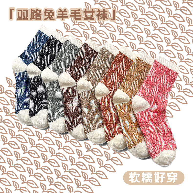 2025 春と秋の新二本針ダブルラプスウサギウールリーフレディースソックスミッドチューブレトロ中国風パーソナライズパイルソックス