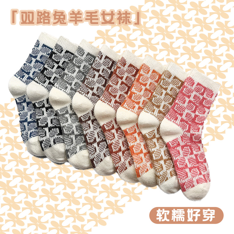 2025 春ウサギウール二本針ダブルウェイ千鳥格子レディースソックス厚く暖かいクリスマスエスニックスタイル秋冬ミッドチューブパイル
