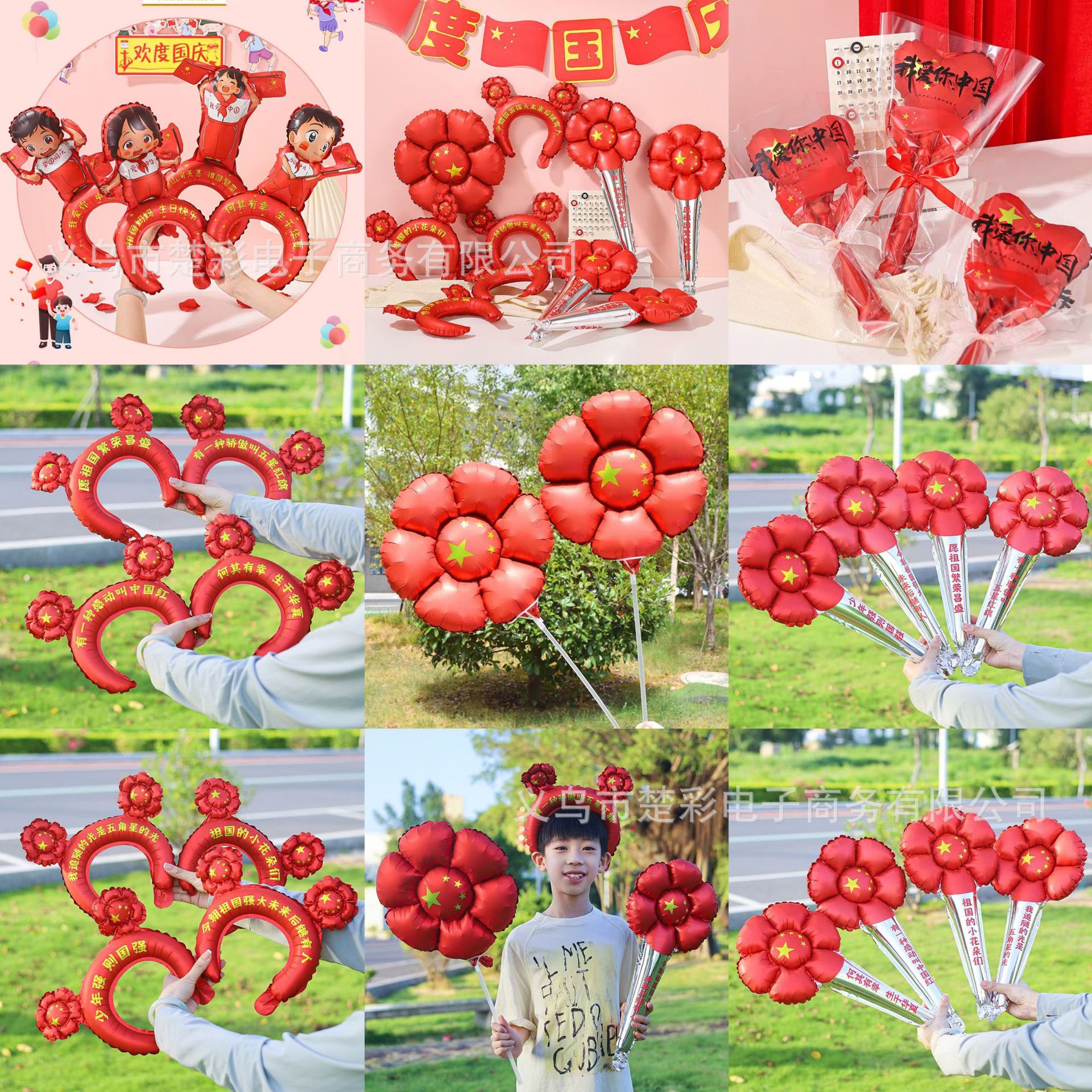十一中秋節の国慶節の風船の国旗五星の赤い花の髪の飾りの贈り物は棒を持ってアルミニウムの膜のボールを祝います。