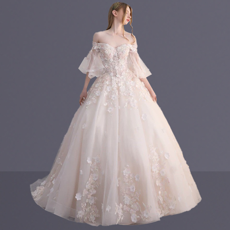 現物ウェディングドレス2024新型レース一字肩夏新型花嫁長袖ウェディングドレス