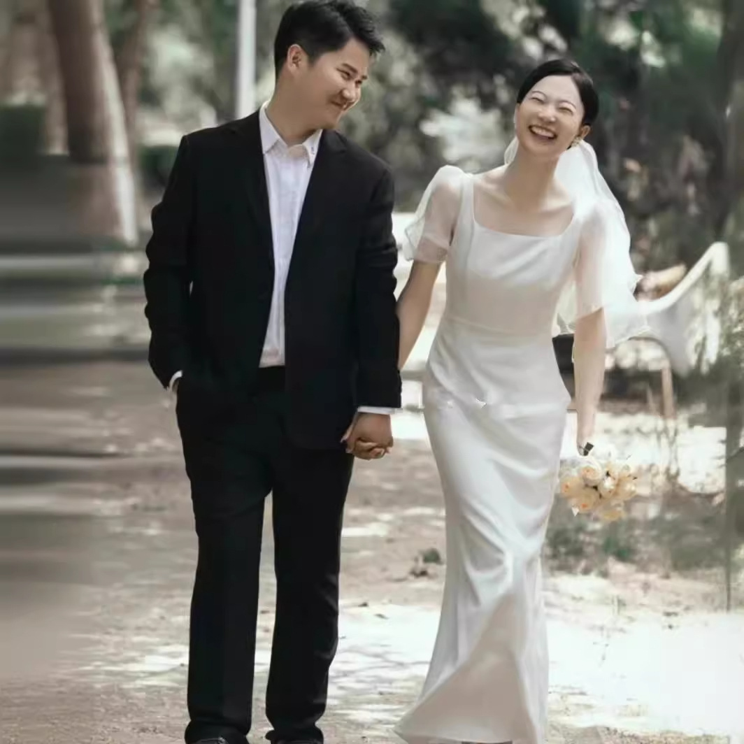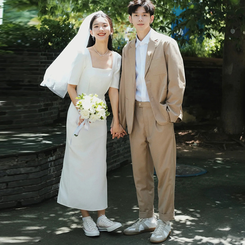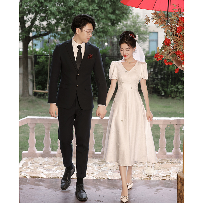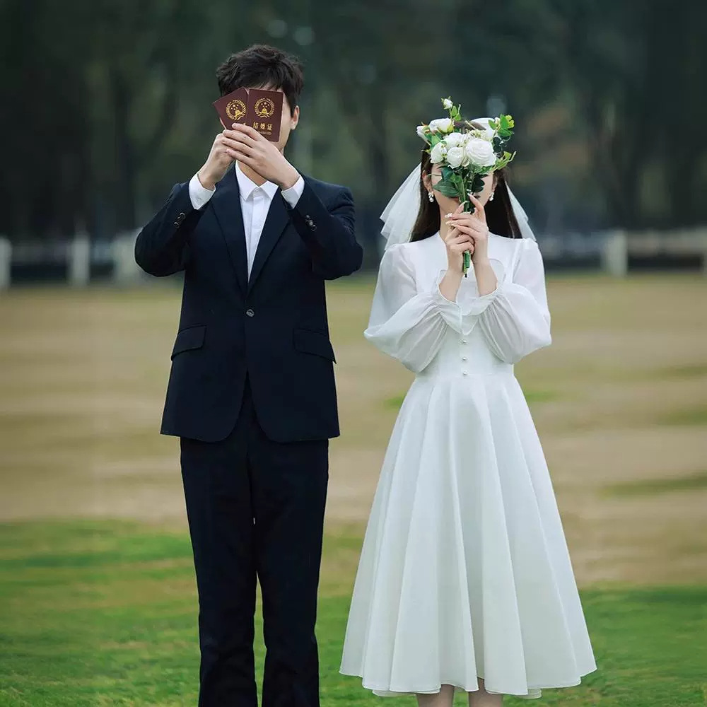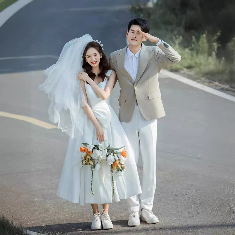 フランス式のサテンの小さい背の軽いウェディングドレスの森系の旅行は簡単で小さい大衆の気質の白い領収書の登録の婚約のドレスをたたきます。