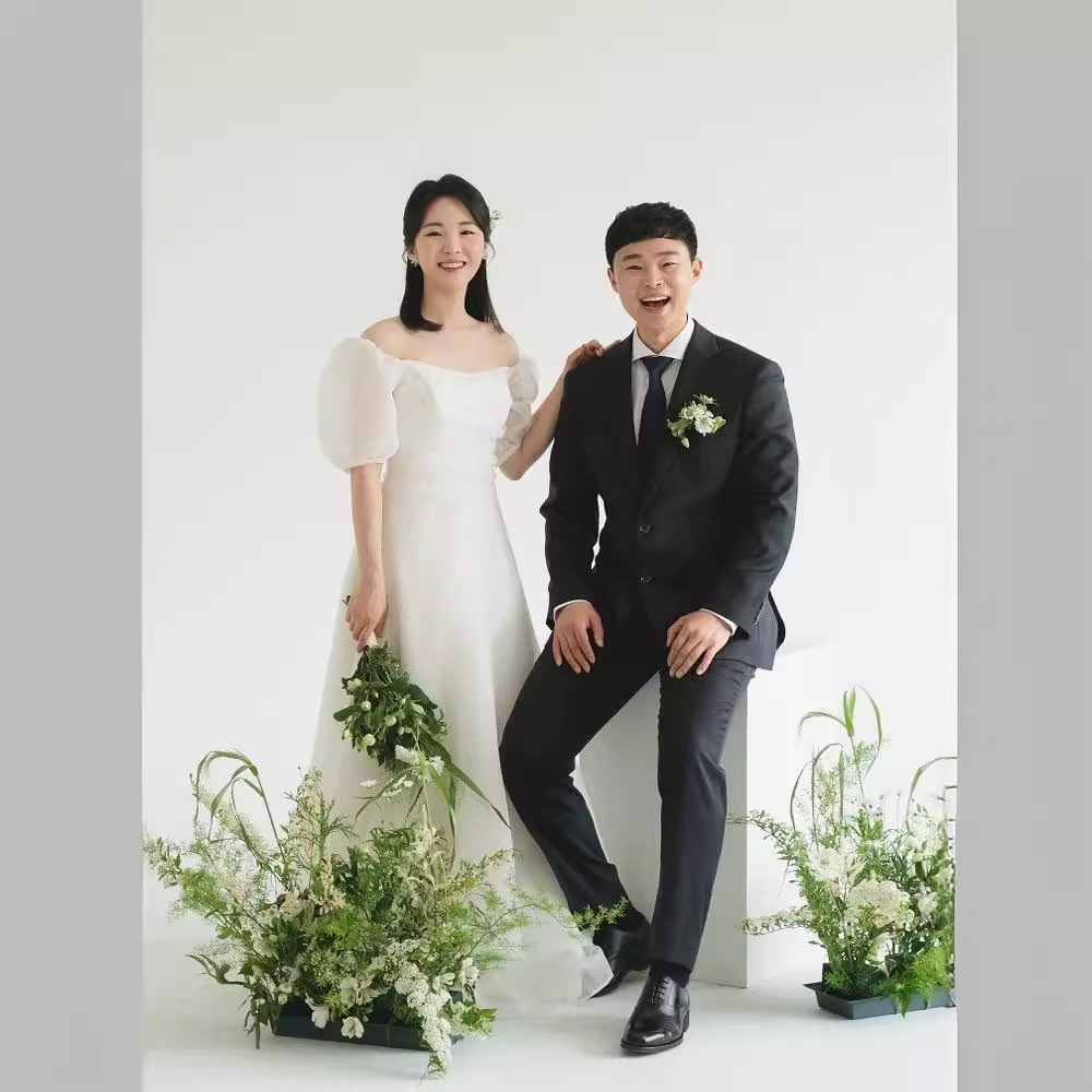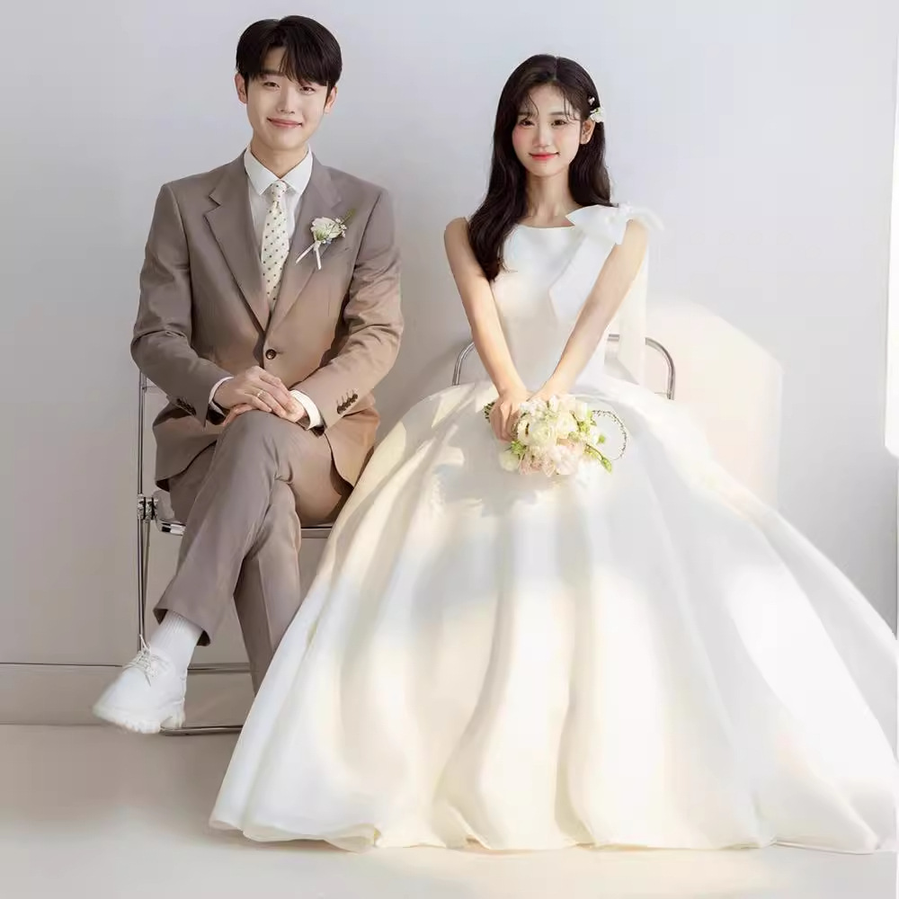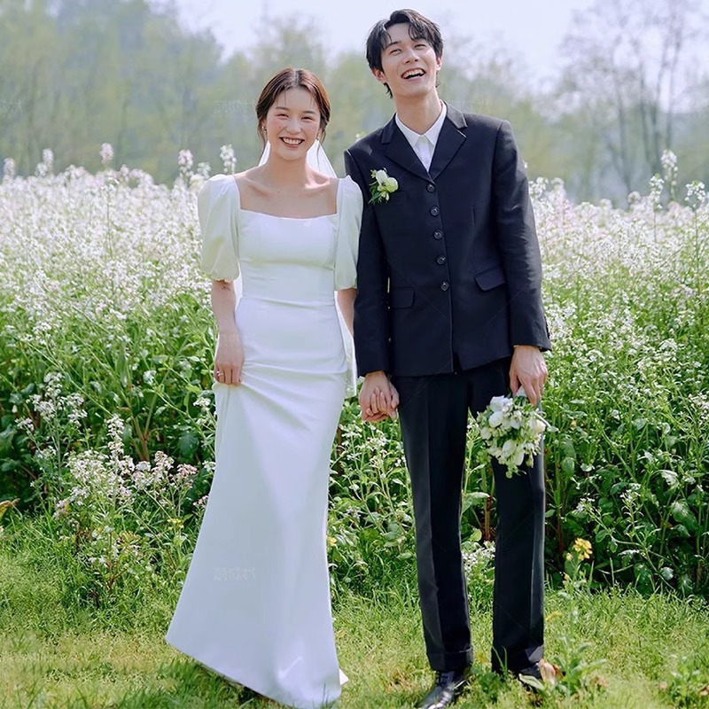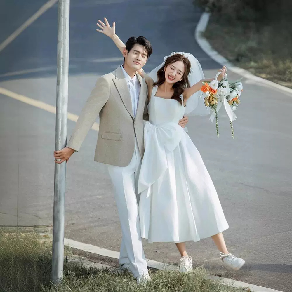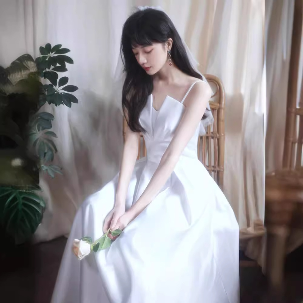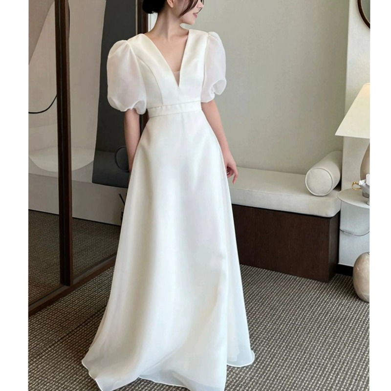 サテンの軽いウェディングドレス2024夏の新型韓国式のシンプルなvネックの泡の袖の小さい人は外に出て紗の旅を撮影します。