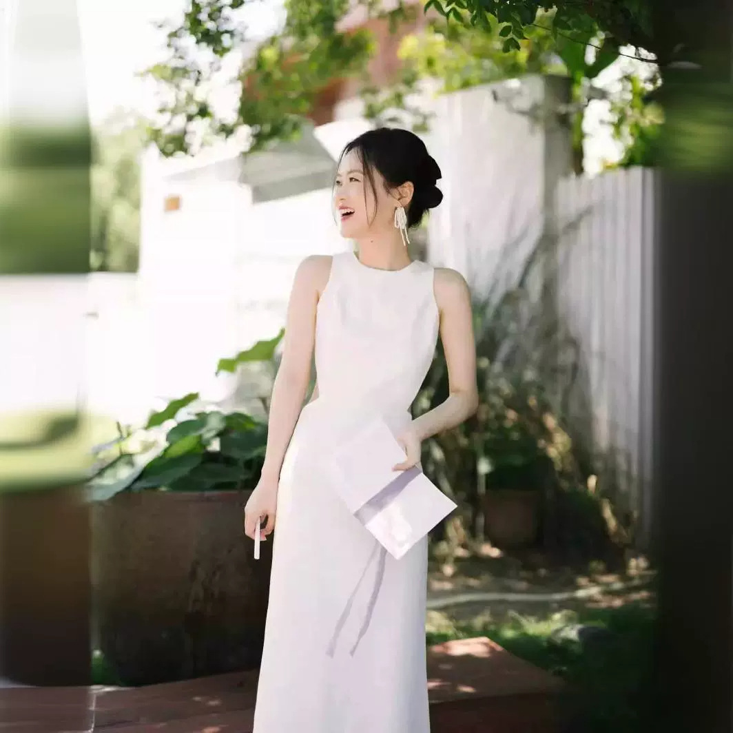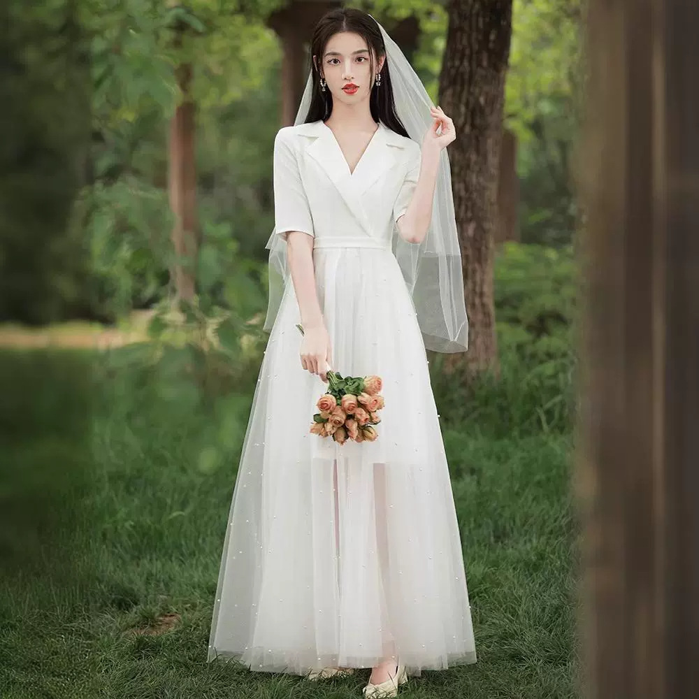 白いvネックの軽いウェディングドレス2024夏の花嫁の敬酒服の婚約は普段はバックドアの領収書を着て登録することができます。