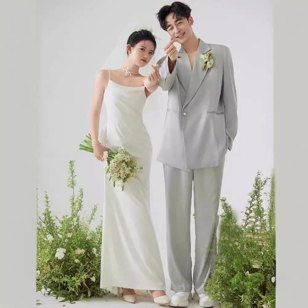 フランスのサテンの軽いウェディングドレスの花嫁はシンプルで、大気のガーターの森系は糸の旅に出て、白い魚の尾のドレスを撮ります。