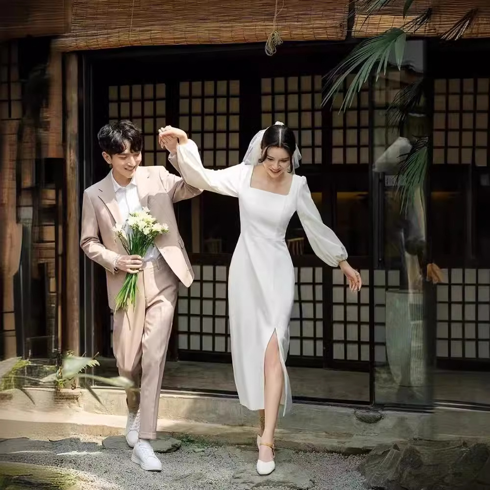 軽いウェディングドレス 秋の花嫁 シンプルな白い結婚登録・婚約式用ドレス ロングドレス