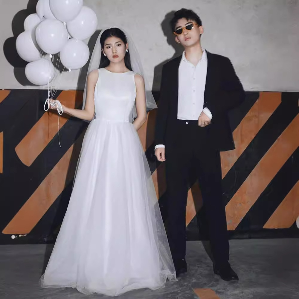 影楼のテーマの軽いウェディングドレスの白いロケ地の旅行はドレスの誕生日の宴会の復古のサテンのガーターをたたいて蓬のスカートを登録します。