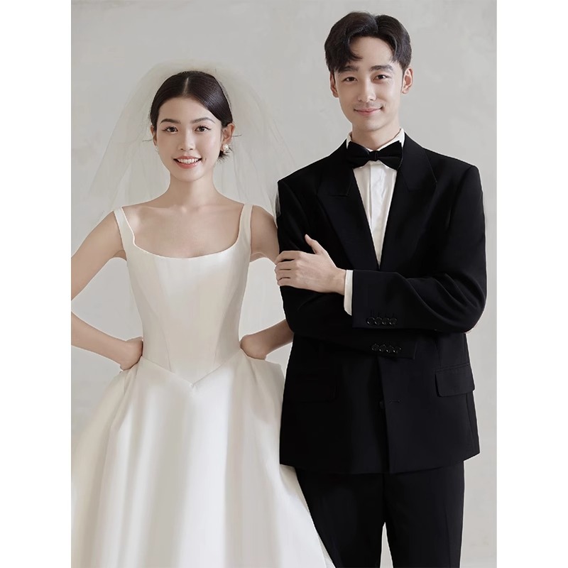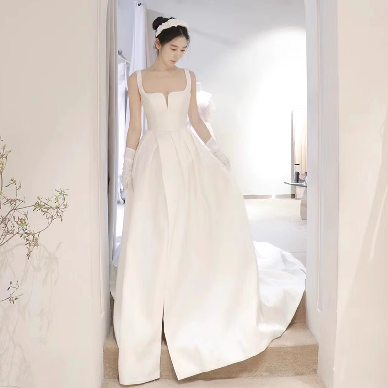 花嫁ストラップ軽ウェディングドレス結婚主糸2024新白色シンプル高級サテン外出糸ドレス