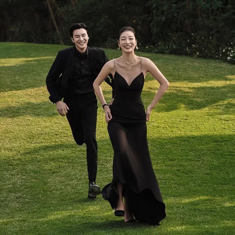 フランス式の黒いストラップのvネックの軽いウェディングドレスの女性の2024の新型の高級感のロケの旅行は小さい背のドレスをたたきます。
