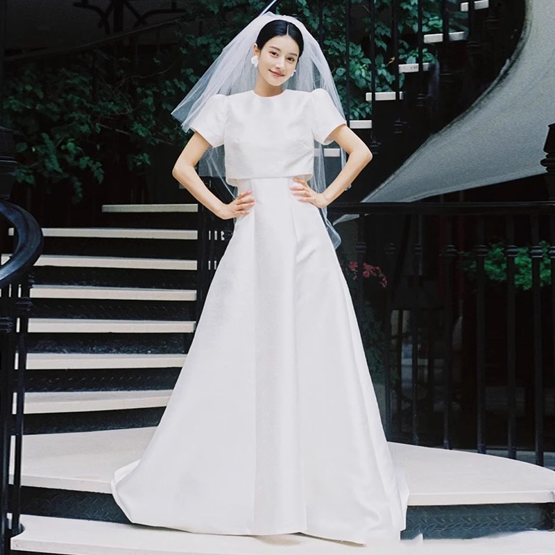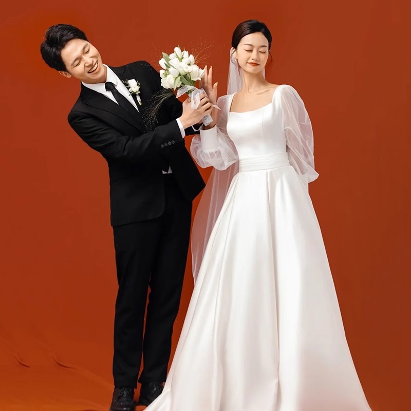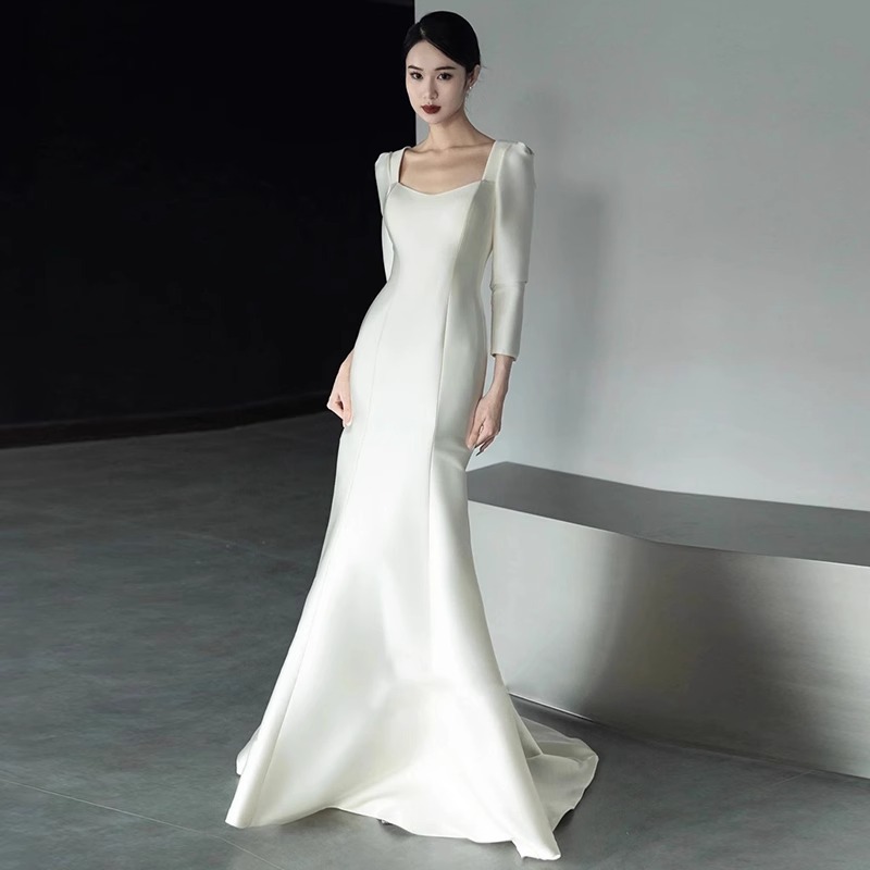 フランス式の軽いウェディングドレス2024新型新婦のシンプルなサテンの長袖は外に出て客を迎えます。